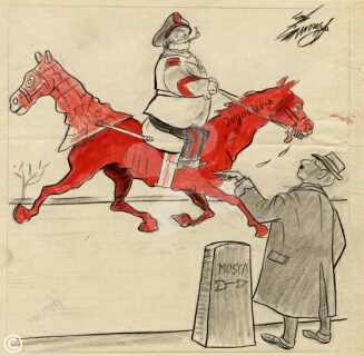 recto: N. 43, 1957, «Tito si riaggancia all'URSS. - E quella testa di cartone non t'impiccia? - No, mi serve per far credere agli americani che sto galoppando verso occidente anche quando galoppo verso oriente»; verso: 27.10.1957