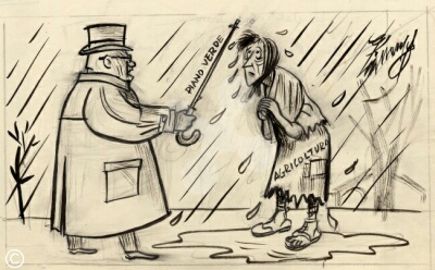 Iscrizioni: verso: Candido N. 17 - 1960, «Lo Stato vede e provvede. - Ecco tieni il manico dell'ombrello, riparati e smettila di lamentarti»