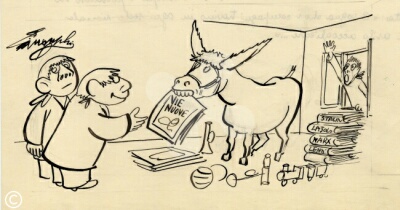 Didascalia: «Obbedienza cieca pronta assoluta. - Contrordine compagni! La frase pubblicata sull'Unità: "Bisogna che i compagni trovino in ogni sede rionale un asino accogliente che offra ad essi la possibilità di istruirsi a di divertirsi", contiene un errore di stampa e pertanto va letta: "Bisogna che i compagni trovino in ogni sede rionale un asilo accogliente..."»