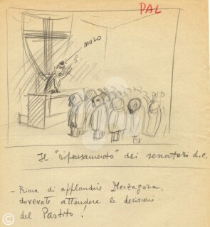 Scheda n°: 1744 Iscrizioni: recto: «Il "ripensamento" dei senatori D.C. - Prima di applaudire Merzagora, dovevate attendere le decisioni del Partito!» Dati tecnici: grafite su carta, 284x220, b/n, N° ingresso disegni: 740 Segnatura: 2.2.5 - 124