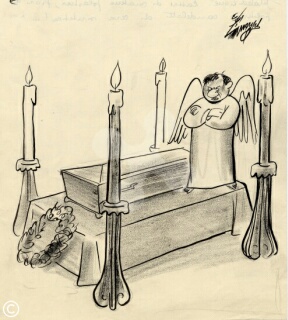 Didascalia: «"Rispetta almen le ceneri!" Ovvero: crudele destino dell'infelice avvelenato da cibi e bevande sofisticate. -Maledizione! Cassa di materia plastica, fiori di politene e candelotti di cera sintetica!...»