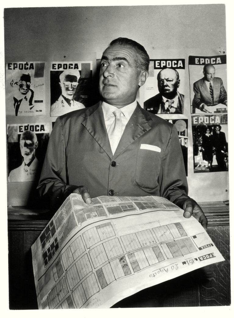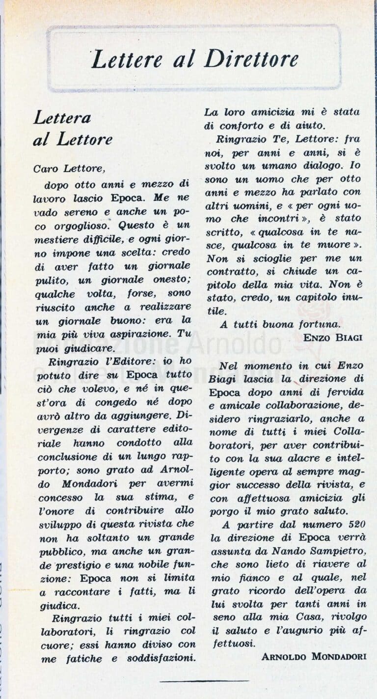 «Epoca» nasce nel 1950, nuovo settimanale di informazione, con una tiratura relativa ai primi anni che si attesta fra le 150 e le 200.000 copie, e vede tra i primi collaboratori Bruno Munari, Cesare Zavattini, Aldo Palazzeschi e Remo Cantoni. Dal 1951 la redazione si arricchisce di nuovi nomi, tra cui Renzo Segàla che assume la carica di condirettore responsabile sotto la direzione di Arnoldo Mondadori, per poi cederla a Enzo Biagi nel 1955. A seguito di un incremento della tiratura, che raggiunge ormai le 400.000 copie, Biagi conferma il ruolo centrale nella conduzione del settimanale assumendone la carica di direttore nel 1957, carica che manterrà fino al luglio del 1960.
