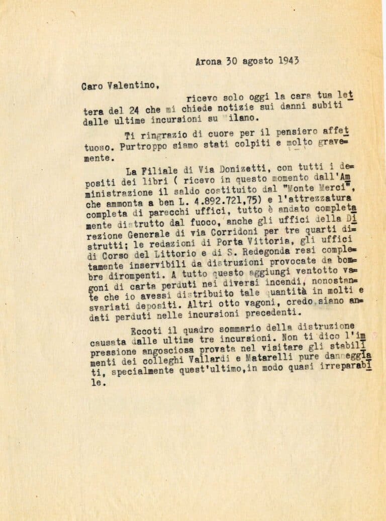 I documenti esposti in questa sezione costituiscono una selezione minima e non esaustiva dei rapporti professionali intrattenuti da Arnoldo con i suoi collaboratori e con le sue collaboratrici. Dalla corrispondenza con Lavinia Mazzucchetti, allo scambio di lettere con Valentino Bompiani all’indomani dei bombardamenti a Milano, emerge il ritratto di un editore accurato e attento, di un uomo che ha dedicato l’intera vita alla propria impresa.