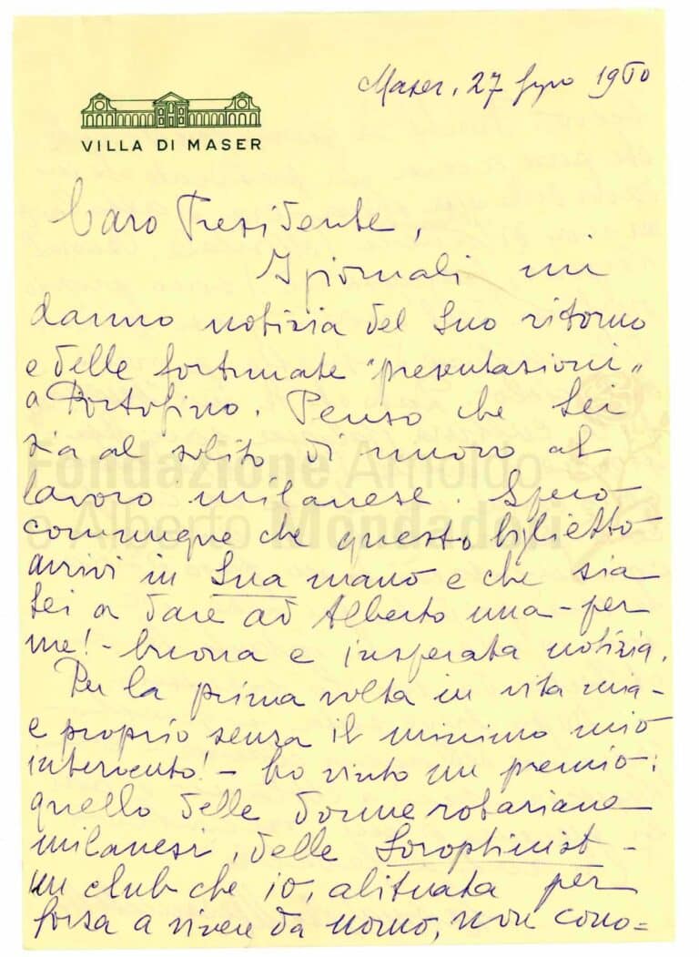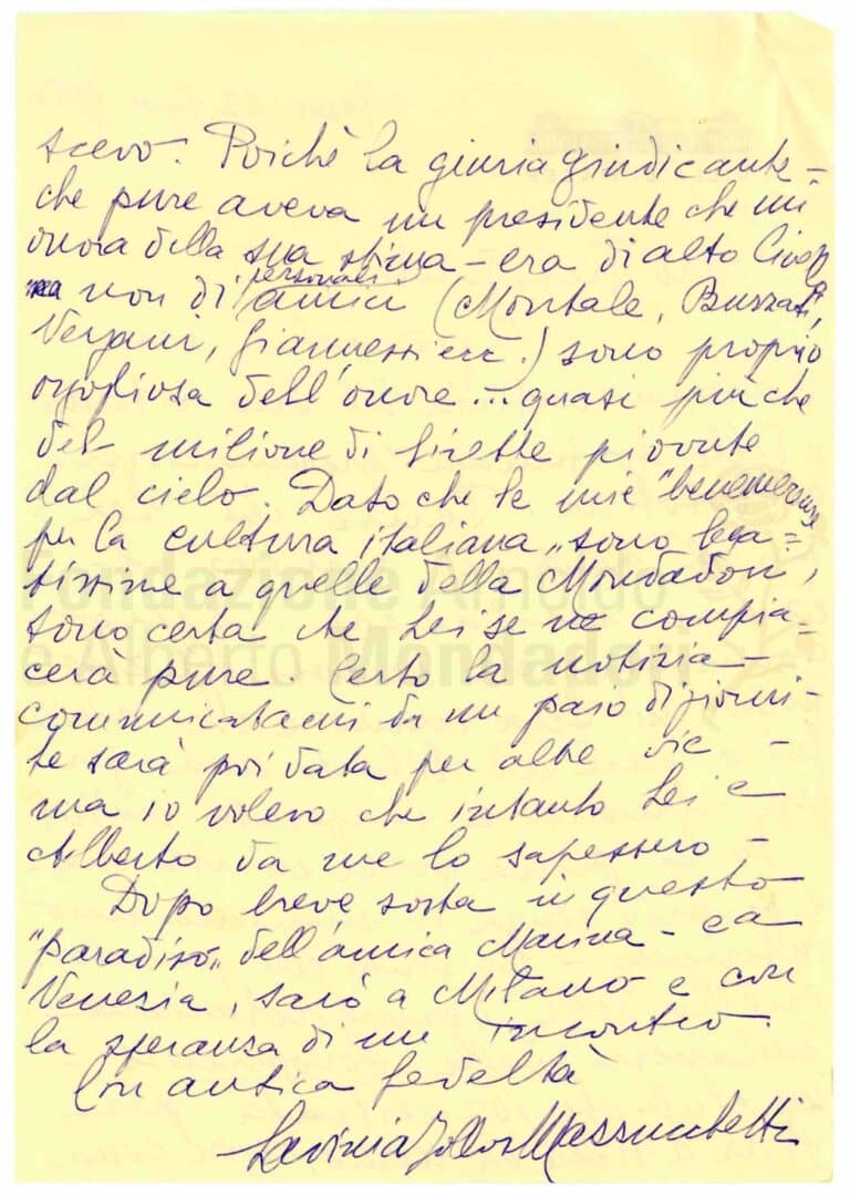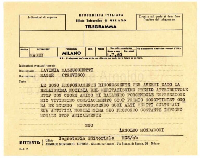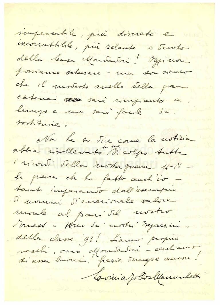 Il lungo rapporto con la casa editrice è ulteriormente avvalorato dai carteggi intercorsi con Arnoldo Mondadori, si vedano la lettera in cui Lavinia Mazzucchetti condivide con l’editore i ricordi «della “nostra guerra” 14-18 – la guerra che ho fatto anch’io – tanto imparando dall’esempio di uomini di essenziale valore morale […]», o la comunicazione della vittoria del premio Soroptimist nel 1960 e le relative congratulazioni ricevute da parte di Arnoldo stesso.
