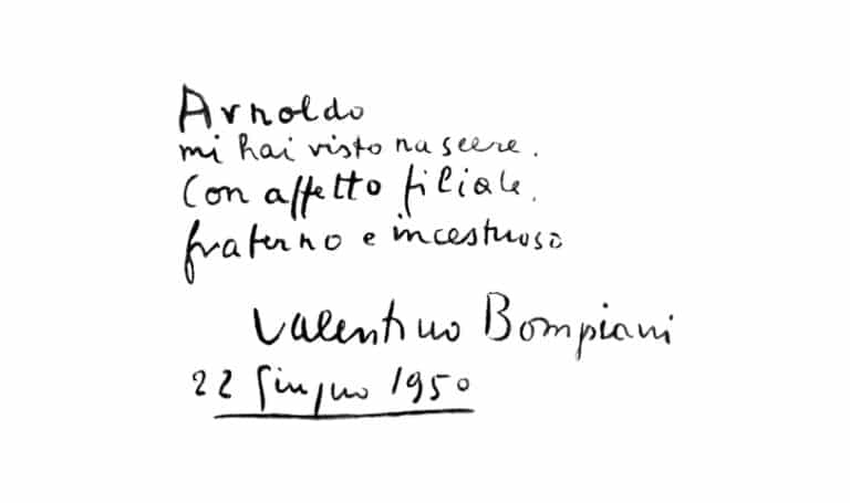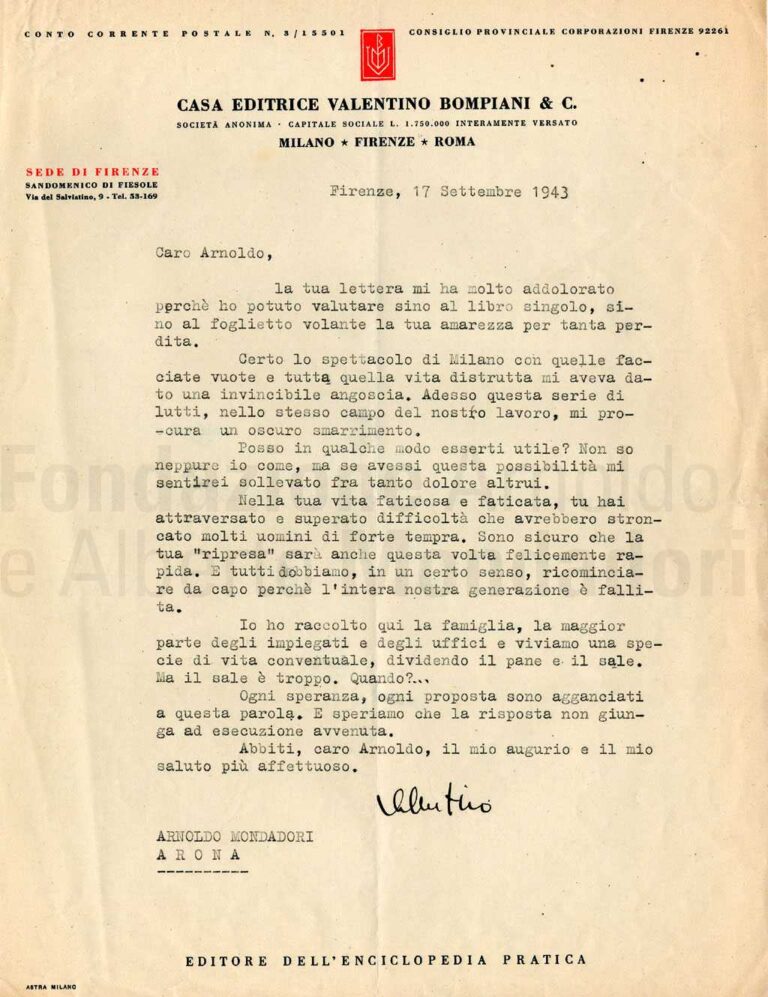 Il 22 giugno 1950 Bompiani scrive sul camino della villa di Meina «Arnoldo mi hai visto nascere. Con affetto filiale, fraterno e incestuoso», un pensiero che esplicita con sincerità il rapporto tra i due editori i quali, se da un lato inevitabilmente si contendevano autori e autrici (fra quelli “rubati” allo stesso Mondadori i nomi di Vittorini, Moravia e Savinio) e discutevano incessantemente a proposito di strategia e programmazione editoriale, dall’altro non mancavano di reciproca solidarietà nel rispetto della causa comune, come testimonia lo scambio di lettere intercorso fra i due nell’estate del 1943, a seguito dello sfollamento della sede milanese, a causa dei bombardamenti che avevano già lungamente colpito la città, e della preoccupazione per gli stabilimenti a Verona.