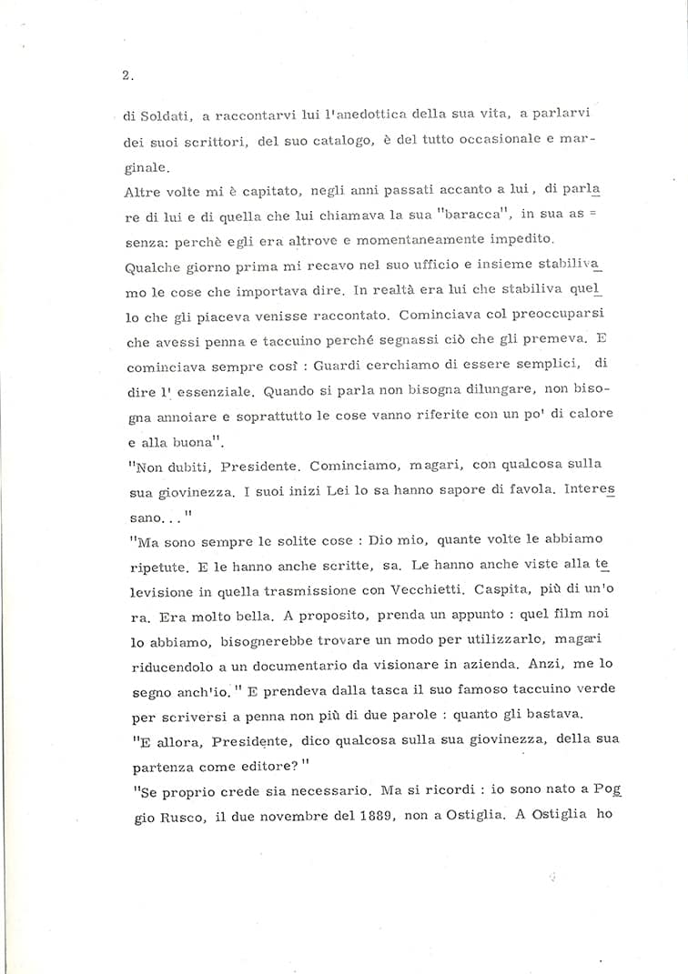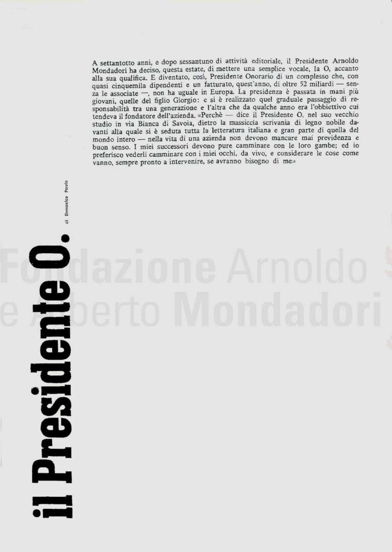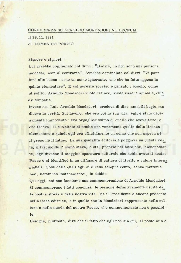 Domenico Porzio ricopre molteplici ruoli presso la casa editrice, dove entra nel 1965 in qualità di direttore dei servizi stampa e assistente del presidente. Assumendo successivamente la carica di direttore per le relazioni pubbliche e con la stampa, e ancora in seguito quella di consulente del direttore generale, Porzio si dedica in particolare all’individuazione di nuove iniziative editoriali e di nuovi progetti così come alla ricerca di nuovi autori, oltre che alla supervisione sui premi letterari e sui rapporti con la stampa per gli autori italiani, incarichi specifici nel settore dei cataloghi d’arte e delle pubblicazioni relative a manifestazioni culturali e artistiche. L’intensa attività svolta e la profonda conoscenza della casa Mondadori e del suo presidente sono testimoniate dai discorsi di Porzio qui riportati, che rivelano al tempo stesso la grande statura dell’editore ma anche la dimensione più intima dell’uomo.
