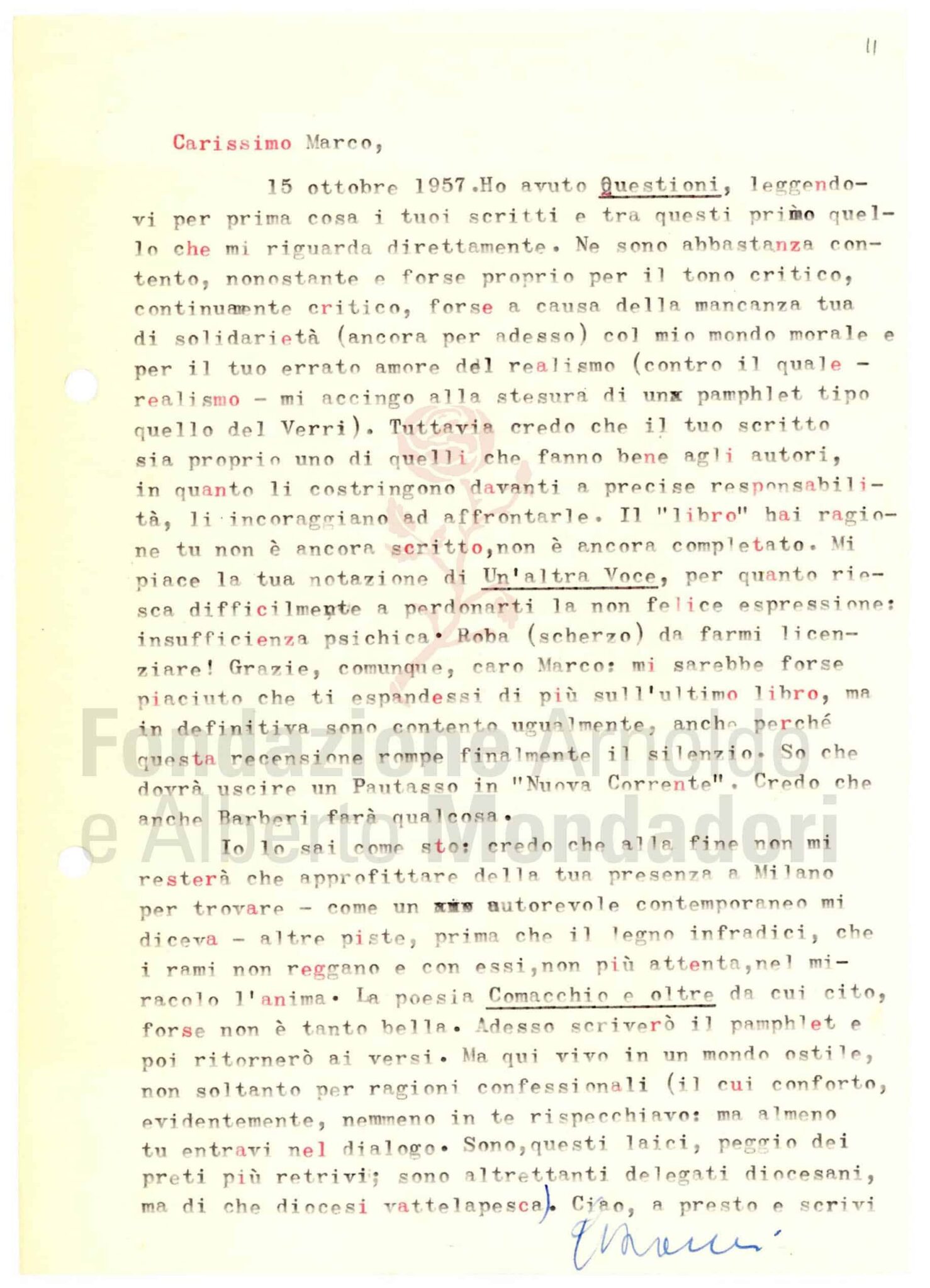 Lettera di Giovanni Giudici a Marco Forti, 15 ottobre 1957. Il saggio di cui parla il poeta è Inizio di Giovanni Giudici, pubblicato in «Questioni» nel 1957 e poi raccolto in Le proposte della poesia (1963).
