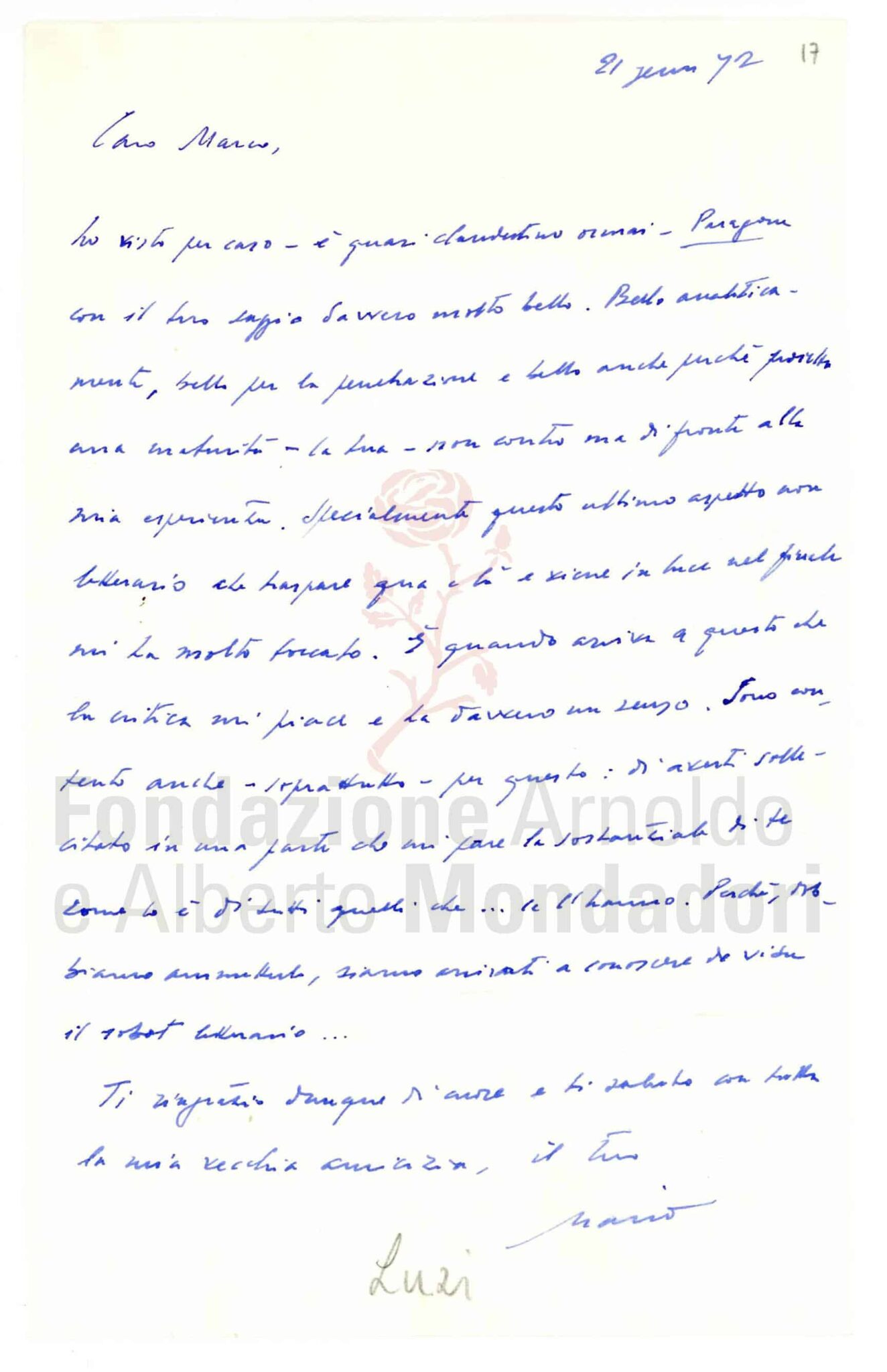 Mario Luzi ringrazia l’amico per il suo articolo pubblicato in «Paragone. Letteratura», 262, 1971: Luzi su fondamenti invisibili.