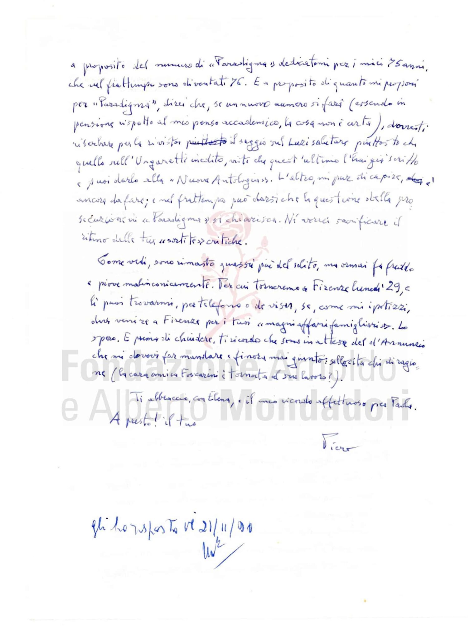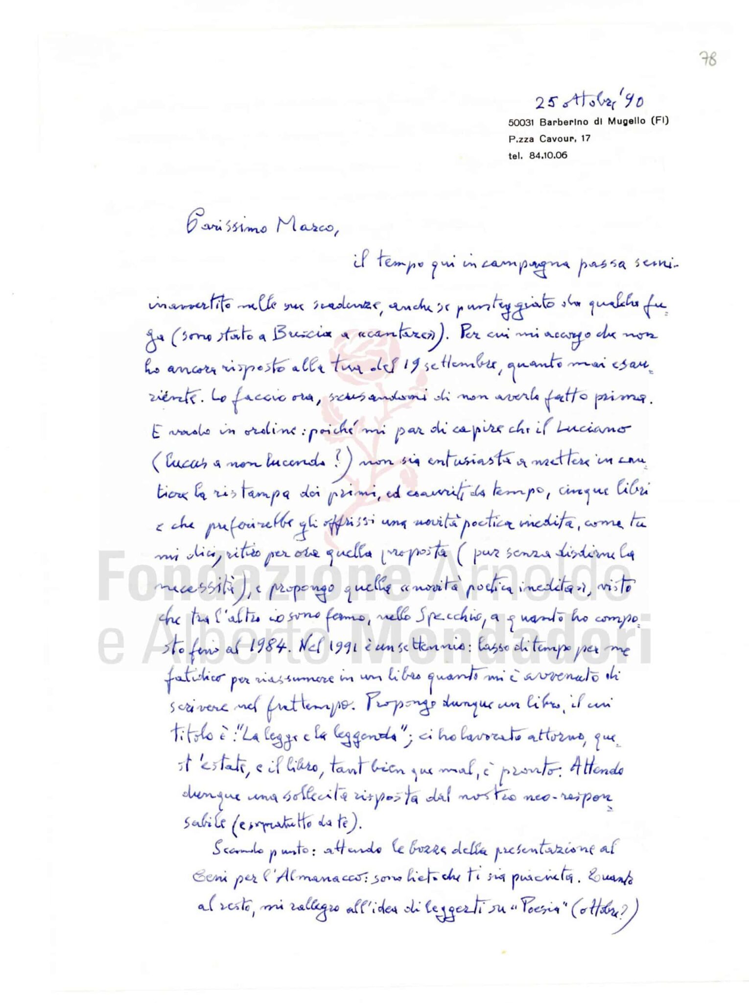 Con questa lettera del 25 ottobre 1990 Bigongiari propone a Forti la sua raccolta da intitolarsi La legge e la leggenda (1986-1991), che uscirà nella collana «Saggi e testi» nel 1992.