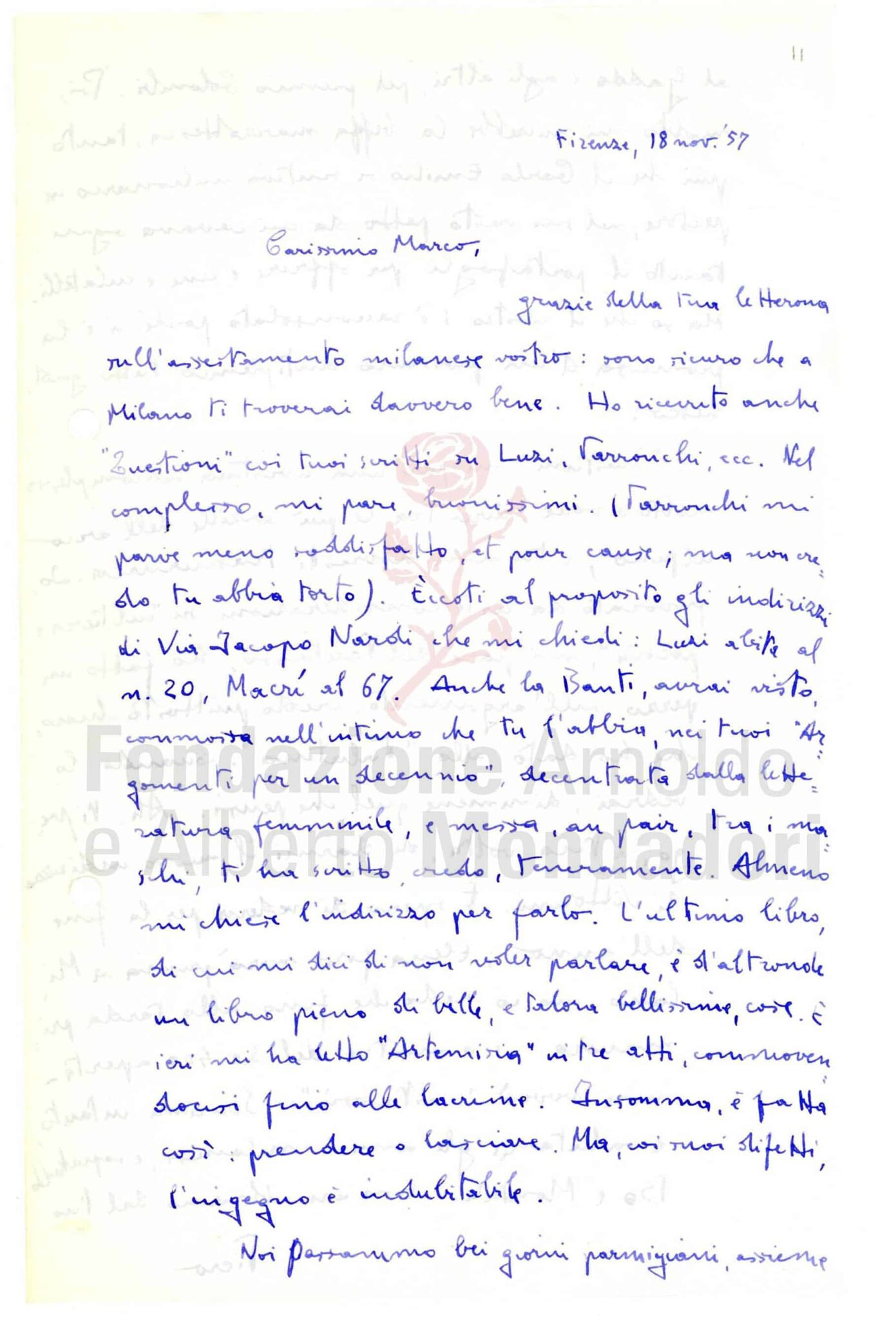 Una delle lettere di Piero Bigongiari a Marco Forti, datata 18 novembre 1957, densa di racconti e aneddoti sulla vita letteraria.