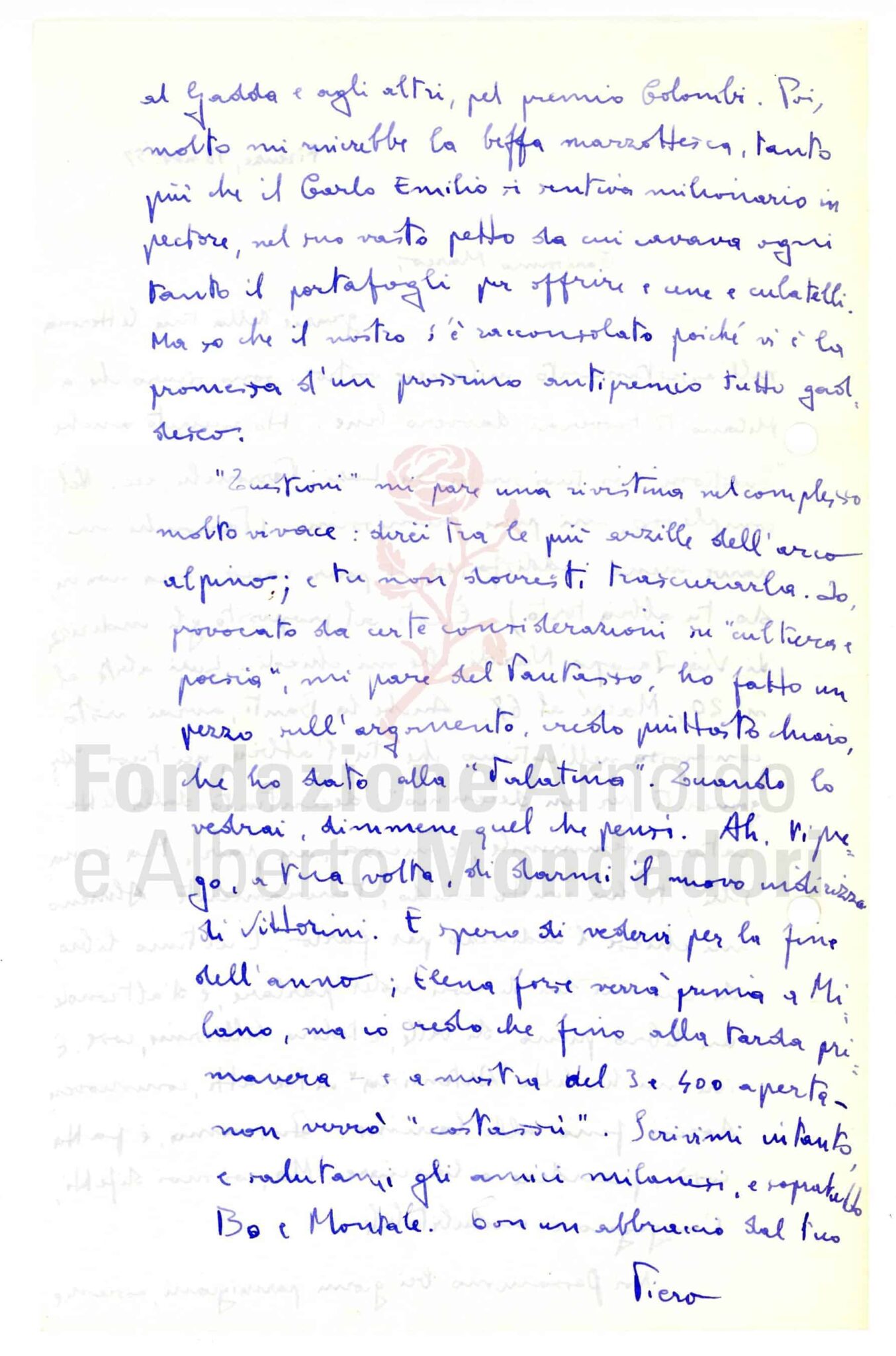 Sui fogli fittamente vergati si sviluppano racconti anche gustosi sui protagonisti della letteratura del secondo Novecento: nella lettera del 18 novembre 1957 (qui riprodotta) si legge di una Anna Banti «commossa nell’intimo» per essere stata, nel saggio di Forti Narrativa e romanzo: argomenti per un decennio («Itinerari», V, 1957), «decentrata dalla letteratura femminile e messa, au pair, tra i maschi»; e del «Carlo Emilio» vittima della «beffa marzottesca» – il Premio Marzotto 1957 andato, contrariamente alle aspettative di Gadda, a Mario Luzi e Umberto Saba – che «si sentiva un milionario in pectore, nel suo vasto petto da cui cavava ogni tanto il portafogli per offrire e cene e culatelli». Ma anche le corrispondenze personali lasciano talora spazio a questioni professionali, perché molti degli amici di Forti sono anche autori di punta del catalogo dello «Specchio»: è il caso, ad esempio, oltre che di Bigongiari, che con la lettera del 1990 propone all’amico ed editore la nuova raccolta La legge e la leggenda (1986-1991) (pubblicata da Mondadori nel 1992), di Mario Luzi e di Giovanni Giudici, dal cui carteggio è tratta una lettera divertente e profonda sul ruolo del critico letterario, con un consiglio scherzoso all’amico: «il giorno in cui ti occuperai del più oscuro poeta italiano per dirne atrocemente male sarà per te un giorno assai più positivo del giorno in cui non dici, né bene, né male, di PPP o di Andrea Zanzotto o verbigrazia di Giovanni Giudici che forse è un modesto poeta ma che non rifiuta una parola delle mille che ha scritto».
