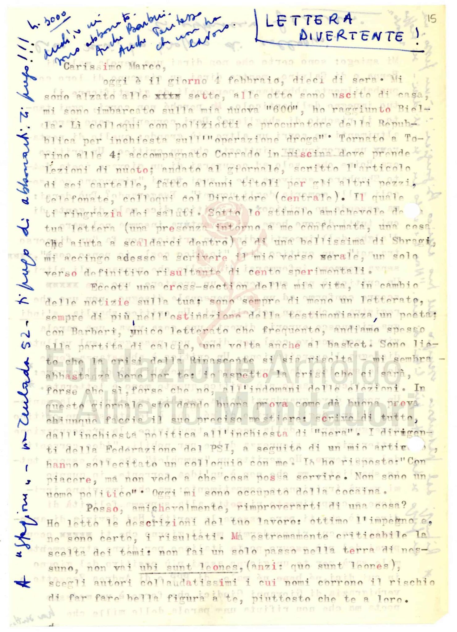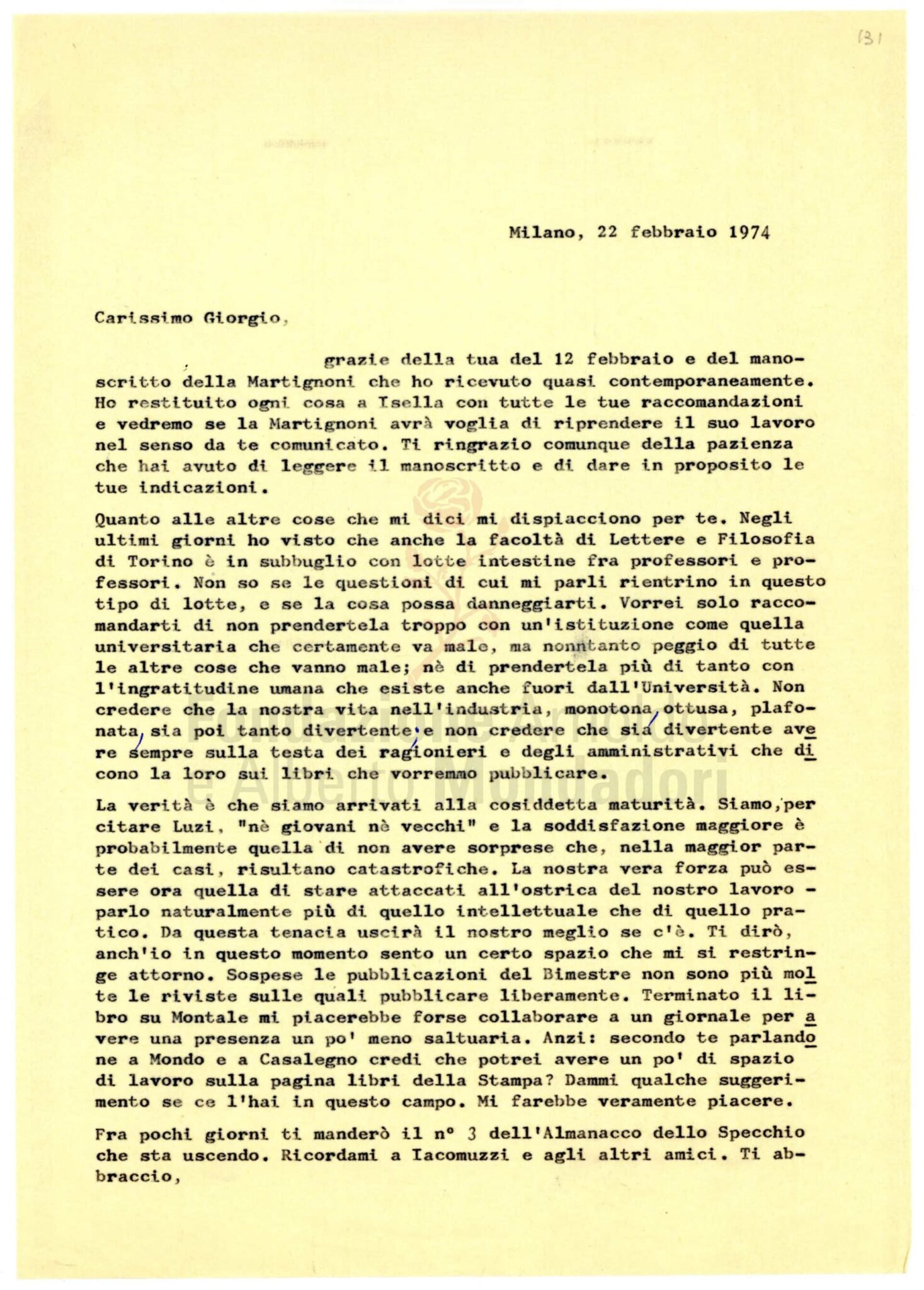 Nella lettera a Giorgio Bàrberi Squarotti del 22 febbraio 1974, di cui si conserva la velina, emerge tutto l’attaccamento di Forti al lavoro intellettuale.