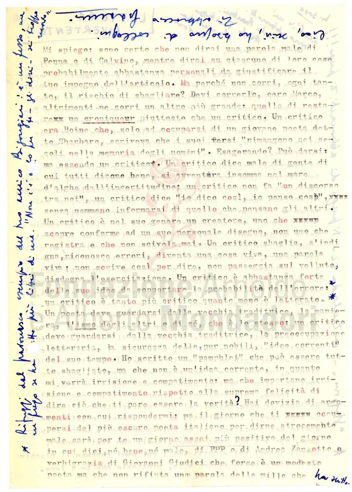Lettera di Giovanni Giudici a Marco Forti, 15 ottobre 1957. Il saggio di cui parla il poeta è Inizio di Giovanni Giudici, pubblicato in «Questioni» nel 1957 e poi raccolto in Le proposte della poesia (1963).