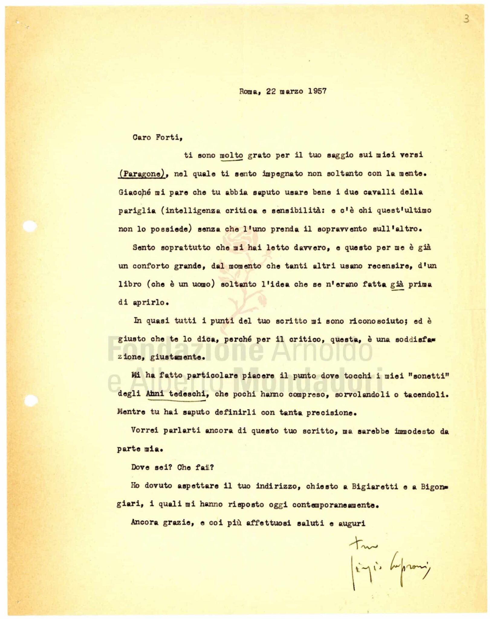 Giorgio Caproni ringrazia Forti per la recensione, uscita sul numero 86 del febbraio 1957 di «Paragone. Letteratura», a Il passaggio d’Enea, pubblicato da Vallecchi nel 1956.