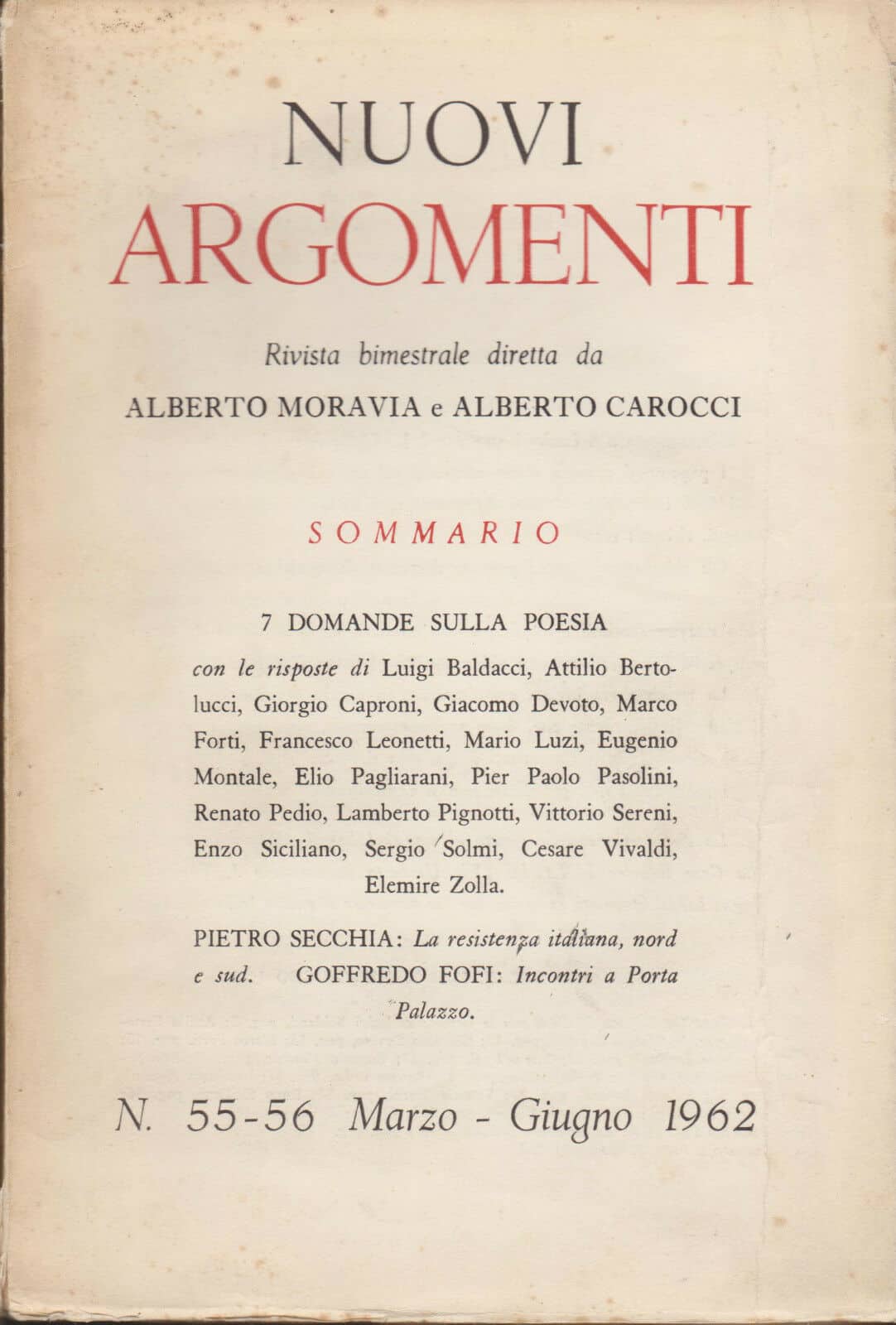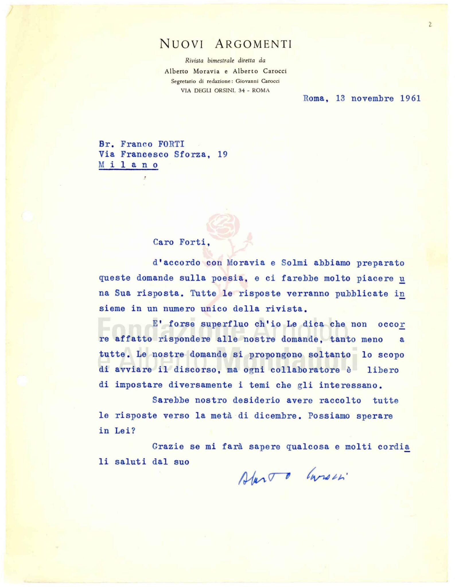 La lettera di Alberto Carocci contiene l’invito a partecipare all’inchiesta sulla poesia che verrà pubblicato sul numero in preparazione della rivista «Nuovi Argomenti»: 7 domande sulla poesia (pubblicata nel numero 55-56 della primavera 1962). Oltre a Forti, aderiranno all’iniziativa, tra gli altri, Baldacci, Bertolucci, Caproni, Luzi, Montale, Pasolini, Sereni.