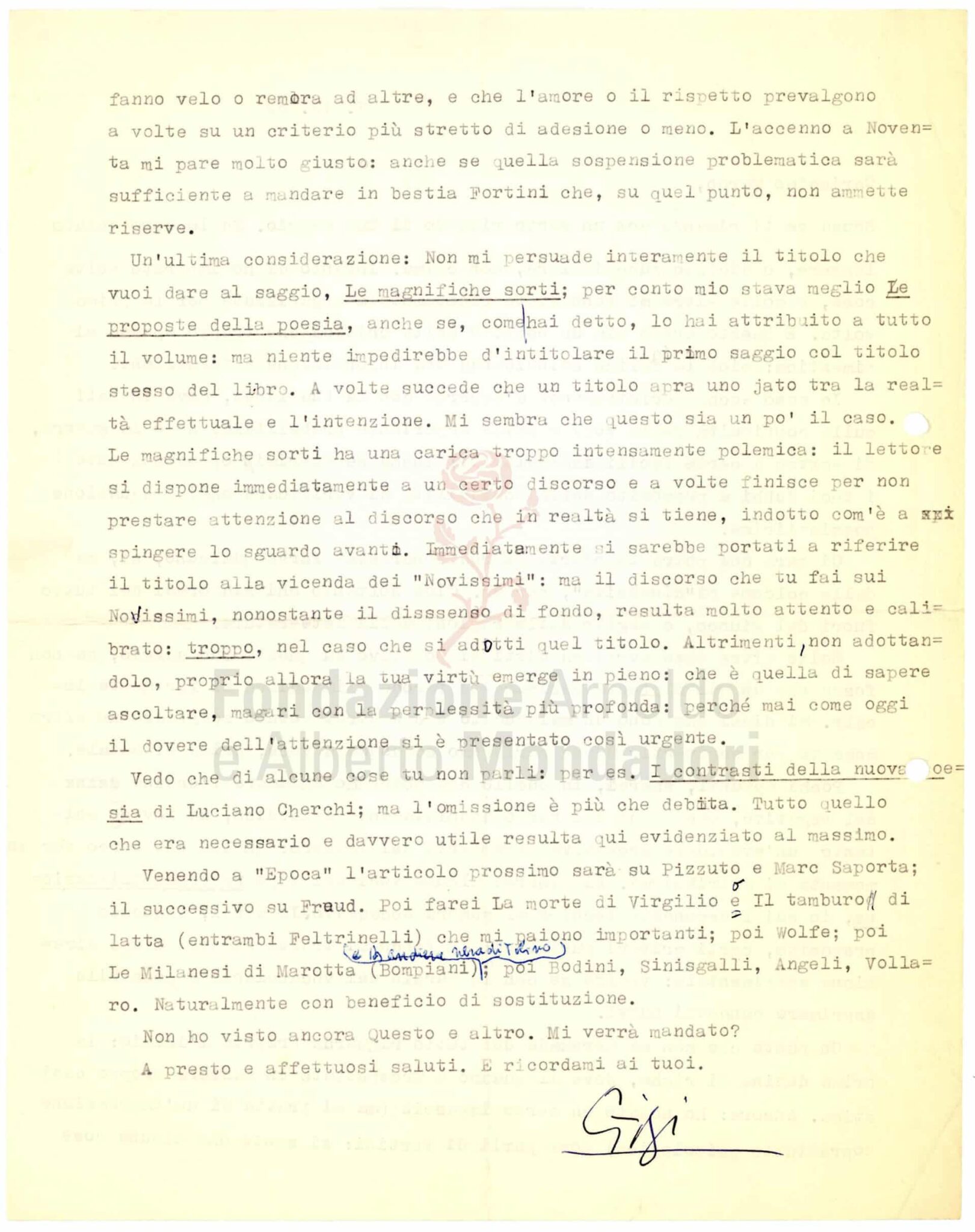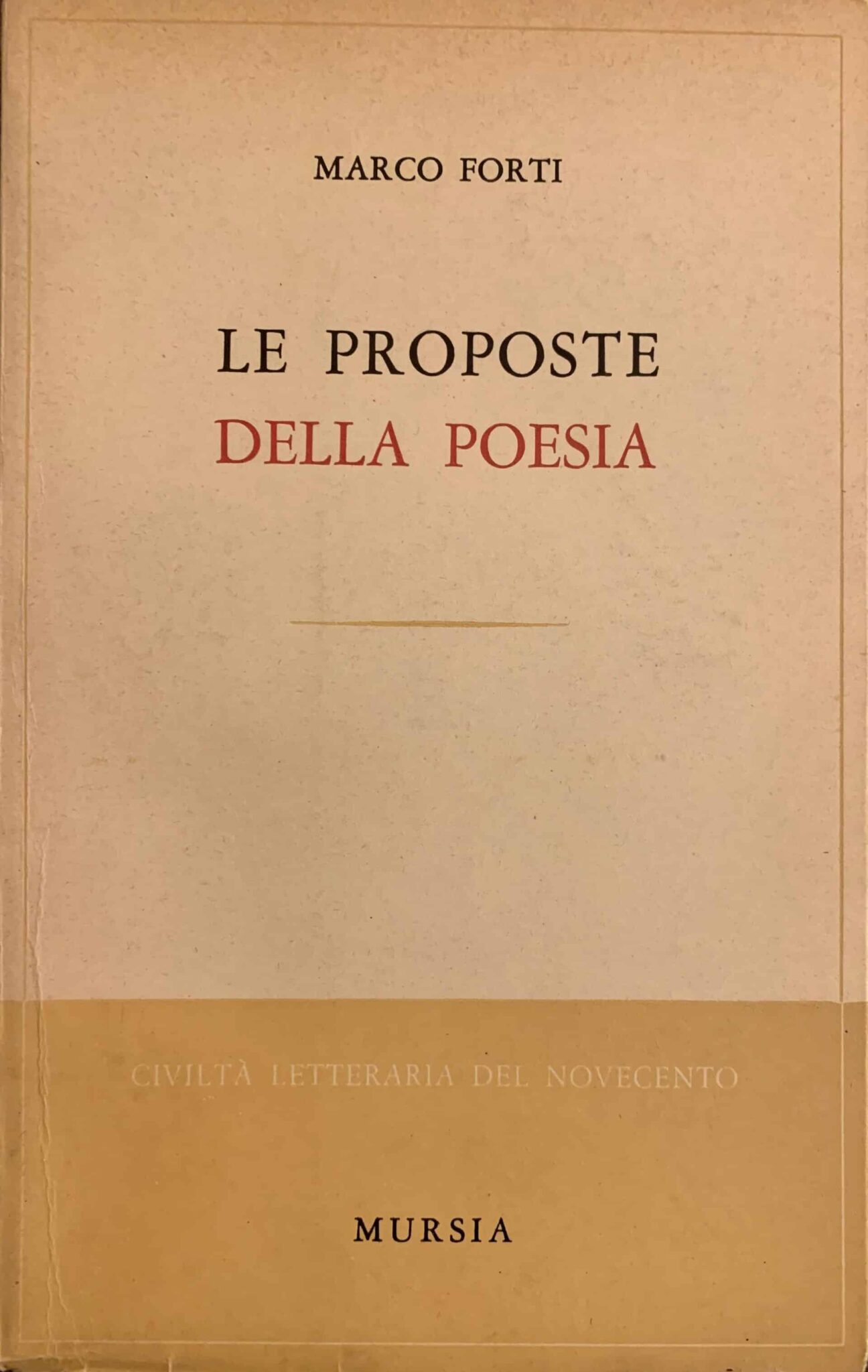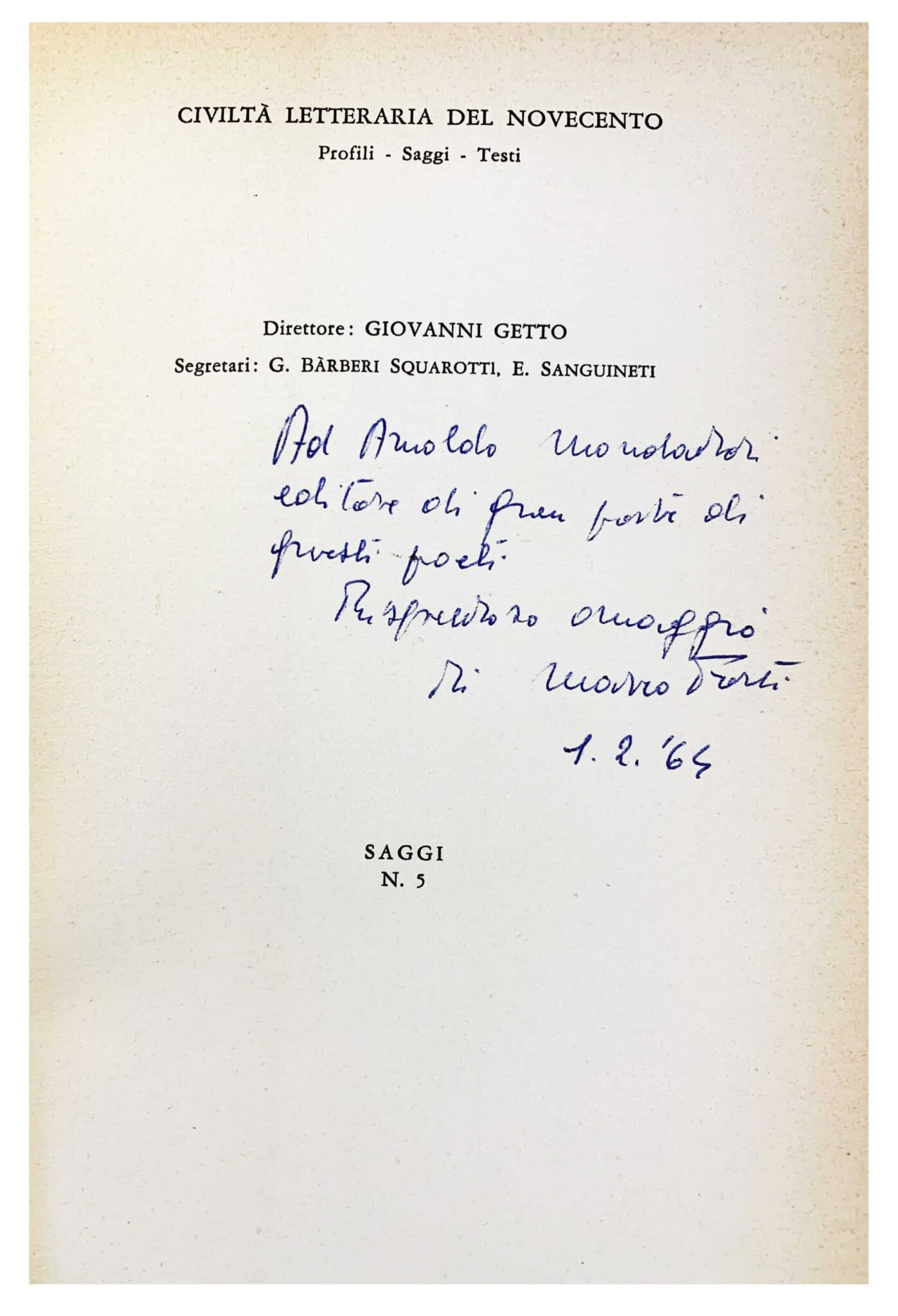 Luigi Baldacci è lettore attento dell’opera critica di Forti, come dimostra questa lettera relativa ai saggi contenuti nella raccolta Le proposte della poesia (Mursia 1963). Tra i libri di Arnoldo Mondadori è conservata una copia del volume con dedica dell’autore.