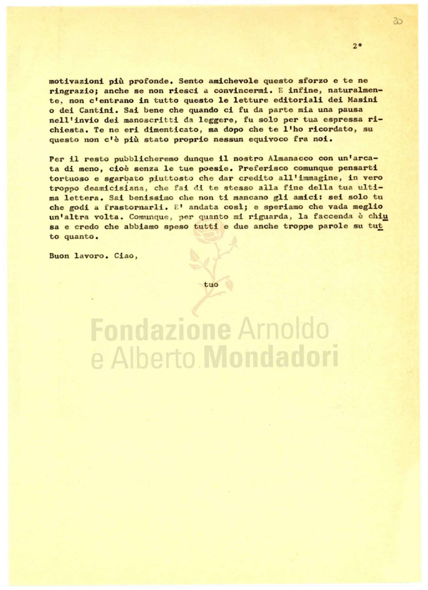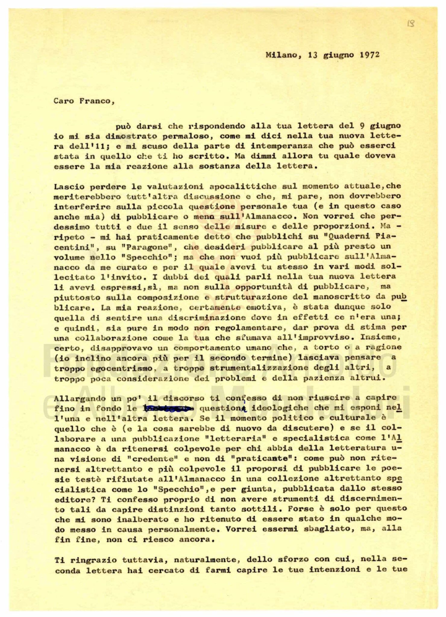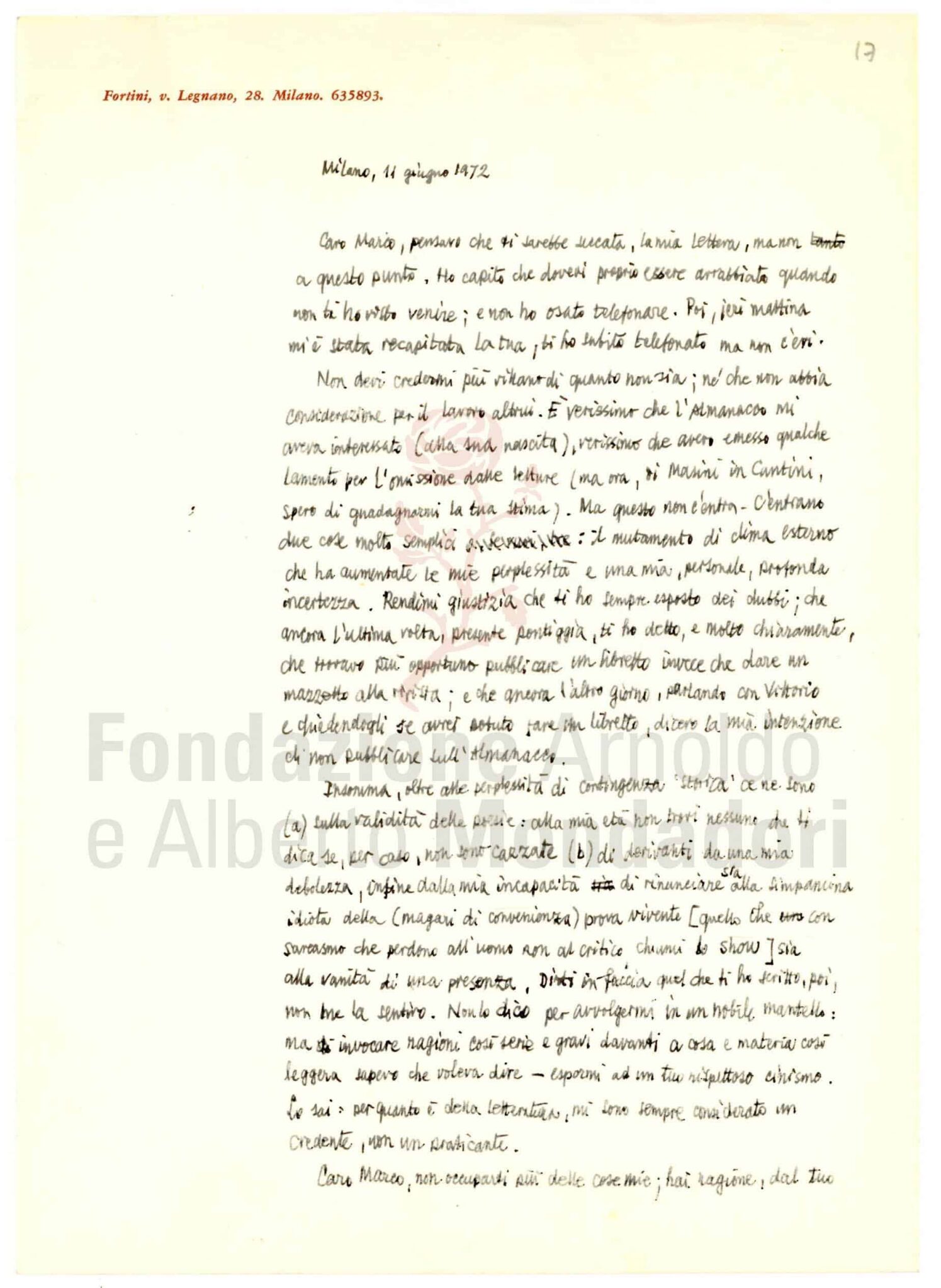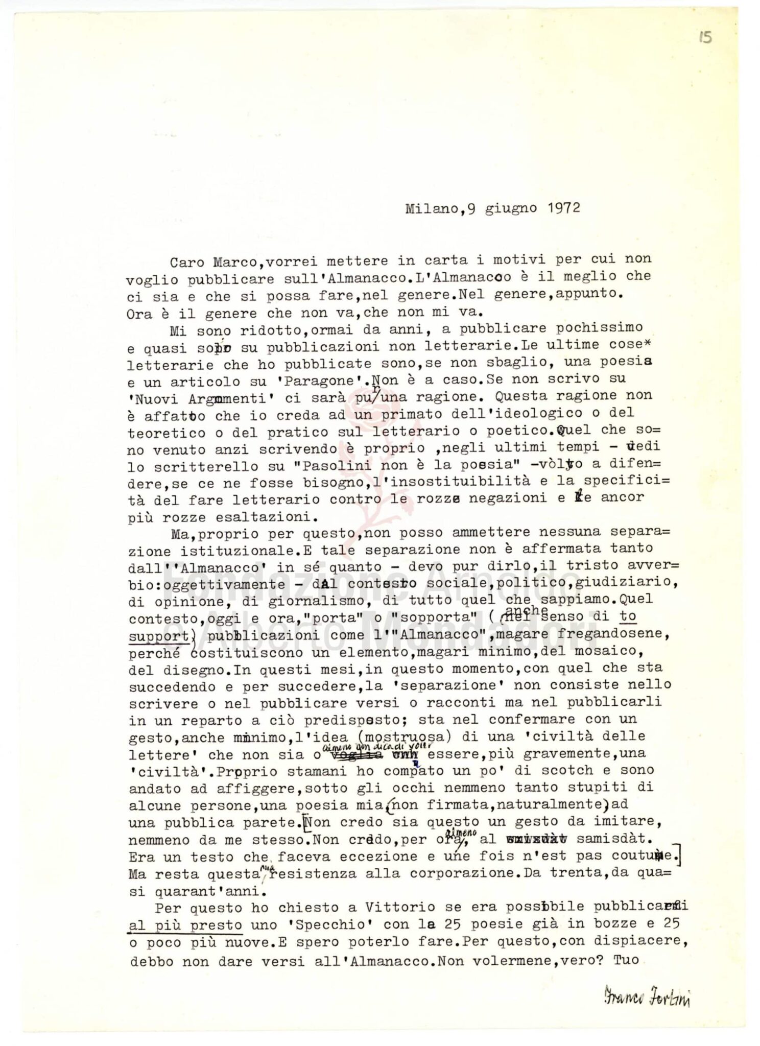 Nell’archivio di Marco Forti sono conservate le corrispondenze con gli autori e, spesso, anche i materiali relativi all’allestimento dei volumi: si vedano qui, a titolo di esempio, i materiali relativi a Il galateo in bosco di Zanzotto, le lettere con Cattafi e con Ungaretti e il piccolo carteggio con Fortini relativo al secondo numero dell’Almanacco.