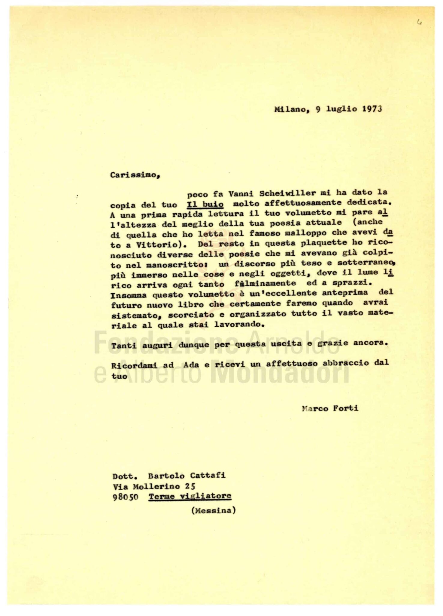 Bartolo Cattafi invia a Forti la plaquette Il buio pubblicata con Scheiwiller nel 1973; due anni dopo, nel 1975, uscirà nello «Specchio» la raccolta del poeta siciliano La discesa al trono.