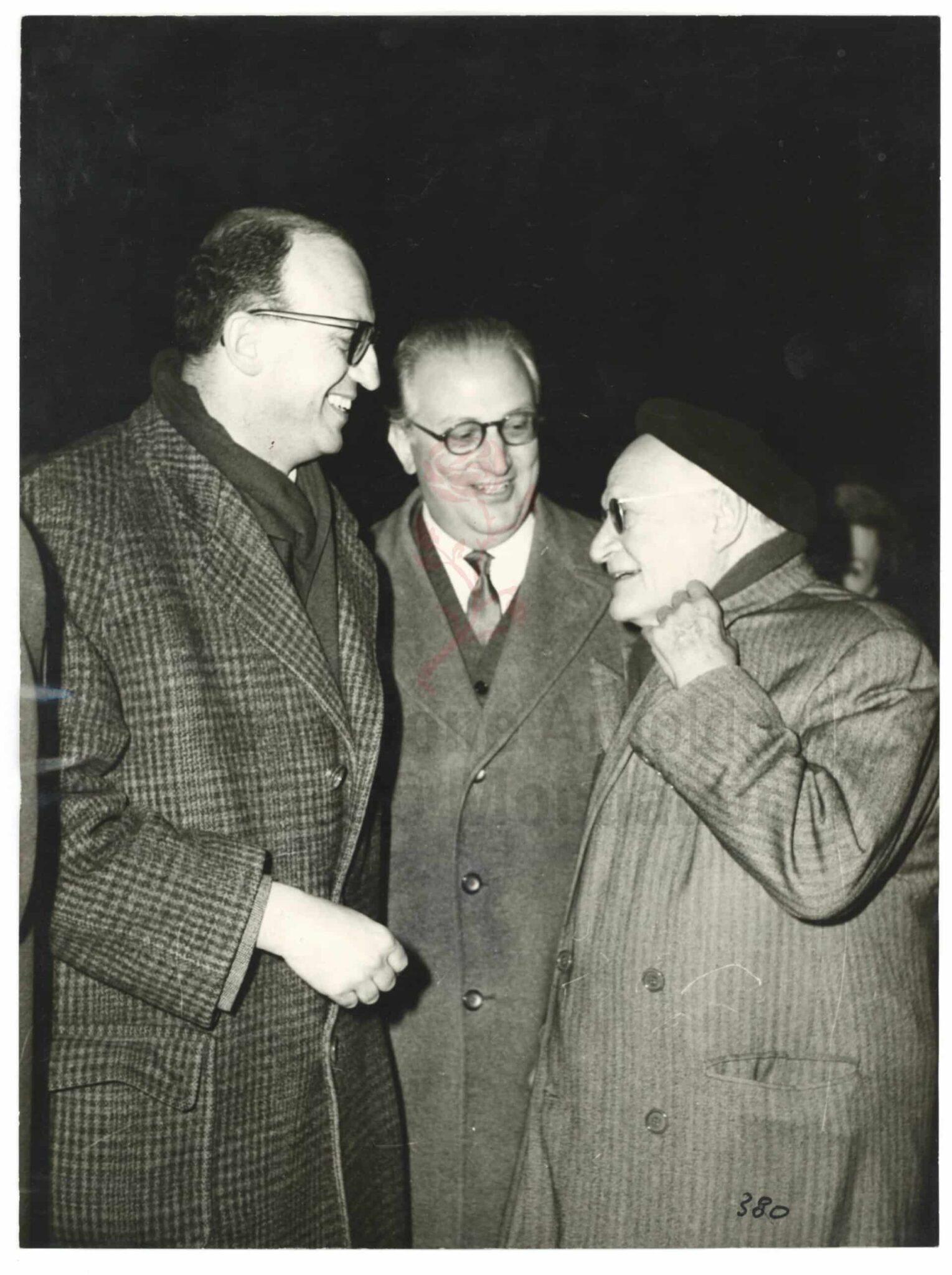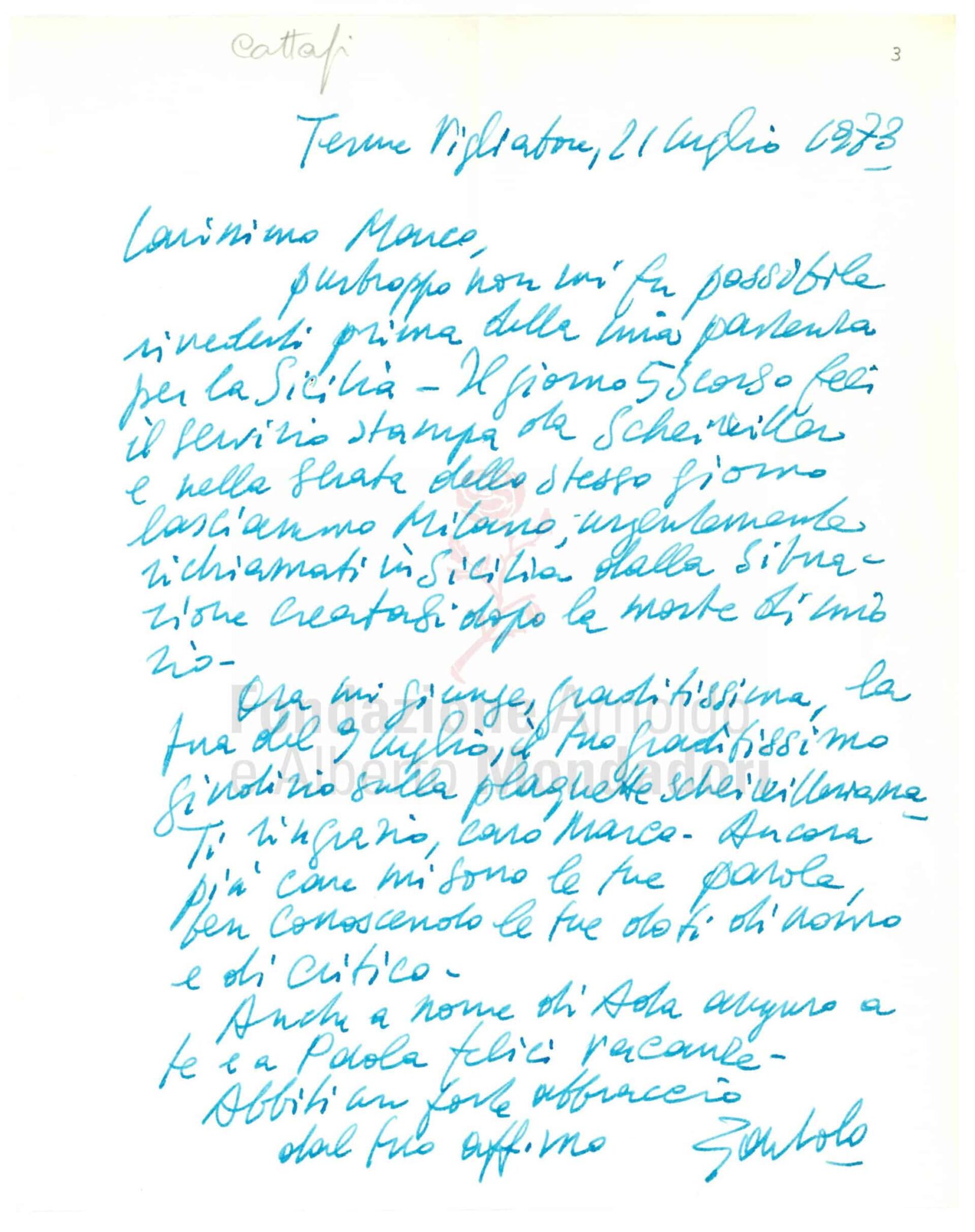 La lettera di Ungaretti, senza data, potrebbe essere riferita alla preparazione del volume Vita d’un uomo. Tutte le poesie a cura di Leone Piccioni, che nel 1969 inaugura i «Meridiani». Nella fotografia, Marco Forti, Piero Bigongiari e Giuseppe Ungaretti.