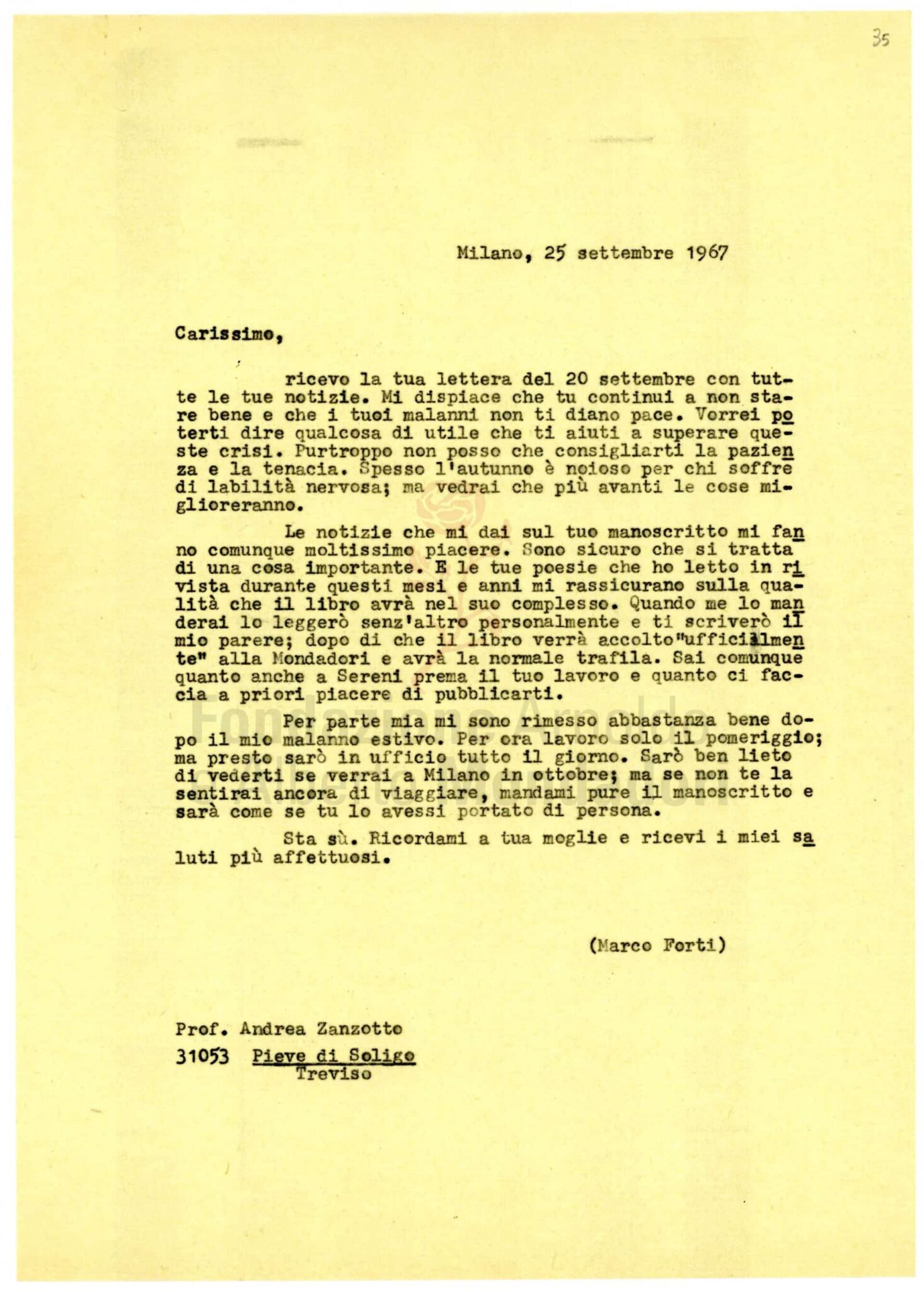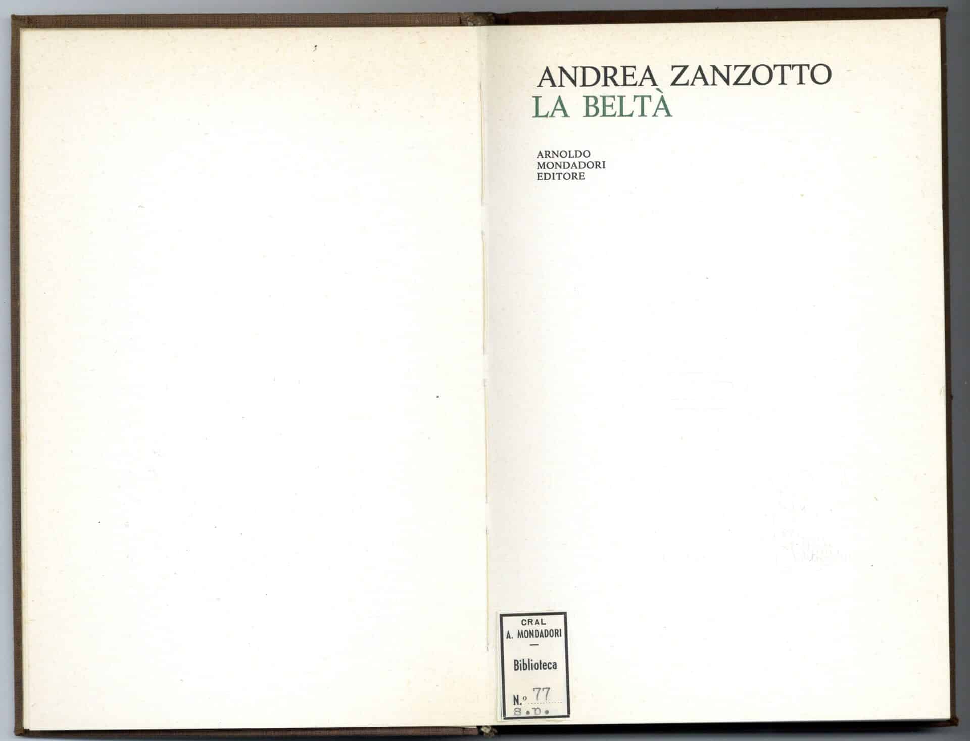 A Forti Zanzotto annuncia nel settembre 1967 la prossima consegna del manoscritto della raccolta La beltà, che verrà pubblicata nello «Specchio» l’anno successivo.