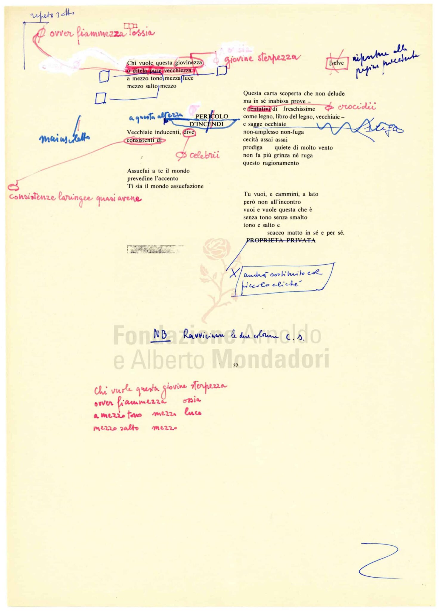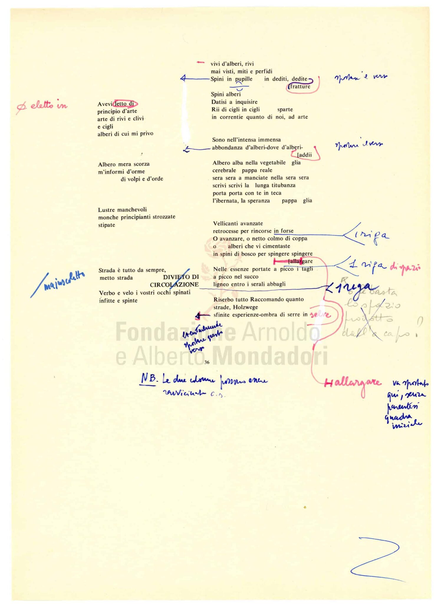 Nell’archivio di Marco Forti si conservano anche tracce del lavoro dei poeti: qui alcune pagine delle bozze, con correzioni manoscritte dell’autore, della raccolta di Zanzotto Il galateo in bosco, pubblicata nello «Specchio» nel 1978.