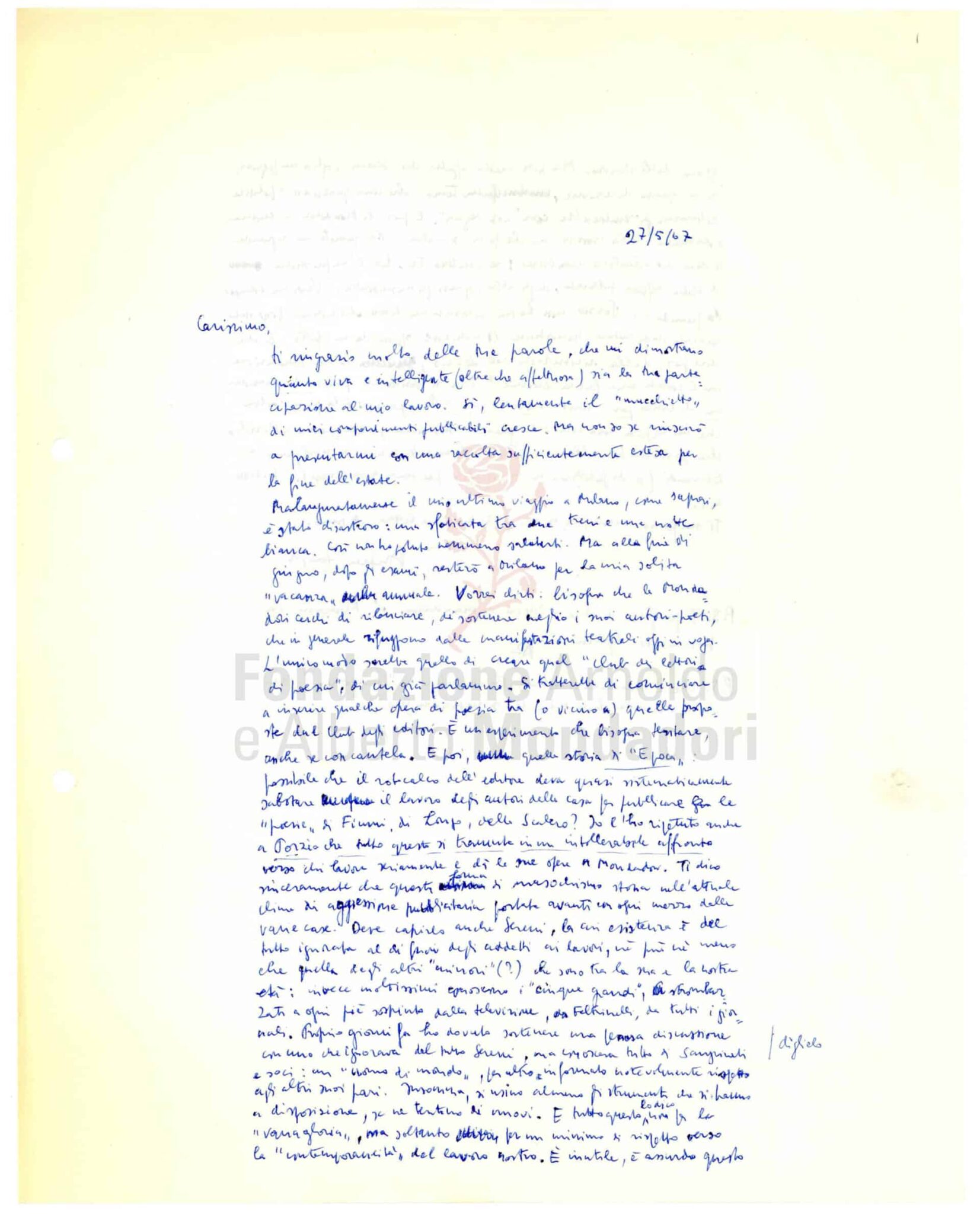 Dopo la firma del contratto, nel 1960, per la curatela del volume antologico I poeti dello Specchio che celebra i vent’anni della collana, Marco Forti entra stabilmente in Mondadori nel 1961. Il primo incarico lo vede impegnato prima nell’Ufficio stampa e pubblicità e poi, dal 1964, come responsabile del Servizio Pubblicità, dal quale coordina la promozione dei libri pubblicati dalla casa editrice procurando articoli e recensioni sulla stampa nazionale e curando personalmente il rapporto con gli autori. Lo si vede bene dalle lettere qui riportate, in cui mostra premura per un Quasimodo «geloso» di Montale dopo l’uscita del pezzo di Baldacci su Auto da fé pubblicato su «Epoca» il 3 luglio 1966 e commissiona immediatamente al medesimo recensore un pezzo da pubblicarsi sempre sul settimanale mondadoriano per riparare al danno; o quando raccoglie le rimostranze di Andrea Zanzotto che, nel maggio del 1967, lamenta la scarsa attenzione della casa editrice ai propri poeti, un «terribile affronto verso chi lavora seriamente e dà le sue opere a Mondadori». L’occasione si presta per una riflessione più ampia, e a tratti amara, sulla vita della poesia italiana, con un riferimento polemico anche ai «cinque grandi» – così Zanzotto chiama i «Novissimi» – «strombazzati a ogni piè sospinto dalla televisione, da Feltrinelli, da tutti i giornali».