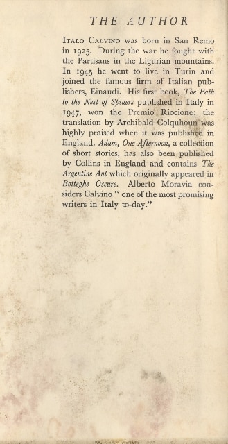 Italo Calvino nasce nel 1923 a Santiago de Las Vega, Cuba. Quando ha due anni la famiglia si trasferisce a San Remo. Tuttavia, in questa nota biografica, i primi due anni della vita dello scrittore vengono “dimenticati”, e si sostiene che Calvino sia nato a San Remo nel 1925! Del resto, come disse una volta lo scrittore: «Dati Biografici: io sono ancora di quelli che credono, con Croce, che di un autore contano solo le opere (Quando contano, naturalmente). Perciò dati biografici non ne do, o li do falsi, o comunque cerco sempre di cambiarli da una volta all’altra. Mi chieda pure quel che vuol sapere, e Glielo dirò. Ma non Le dirò mai la verità, di questo può star sicura».
