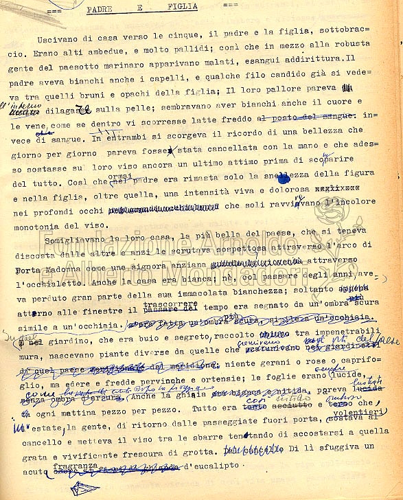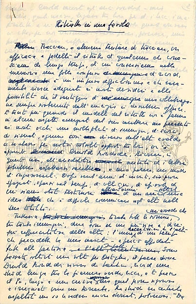 Le pagine riprodotte sono la prima della stesura manoscritta del testo e la medesima nella successiva versione dattiloscritta, con correzioni autografe dell’autrice, e fanno parte del materiale consegnato dalla de Céspedes alla casa Editrice per la pubblicazione. Il racconto è raccolto nel volume Fuga, Mondadori (“Lo Specchio”) 1940.