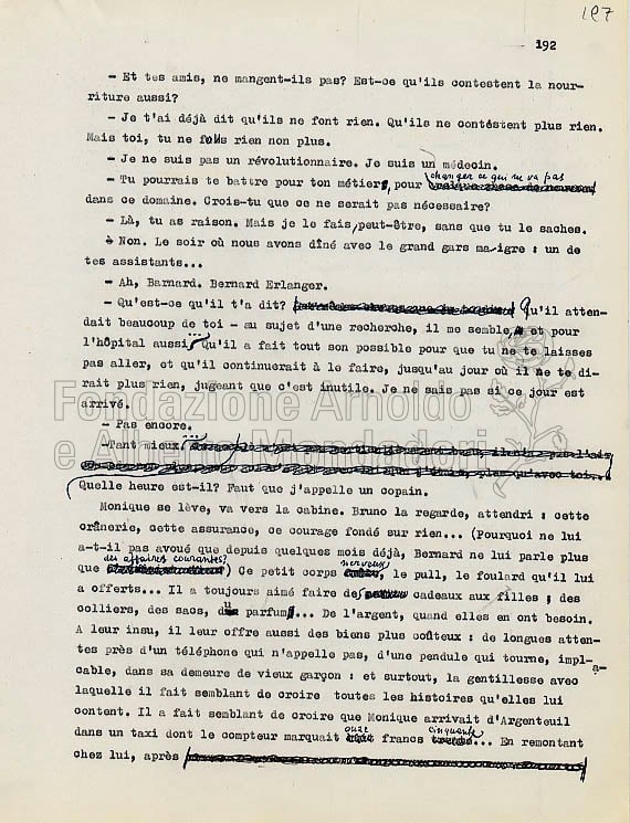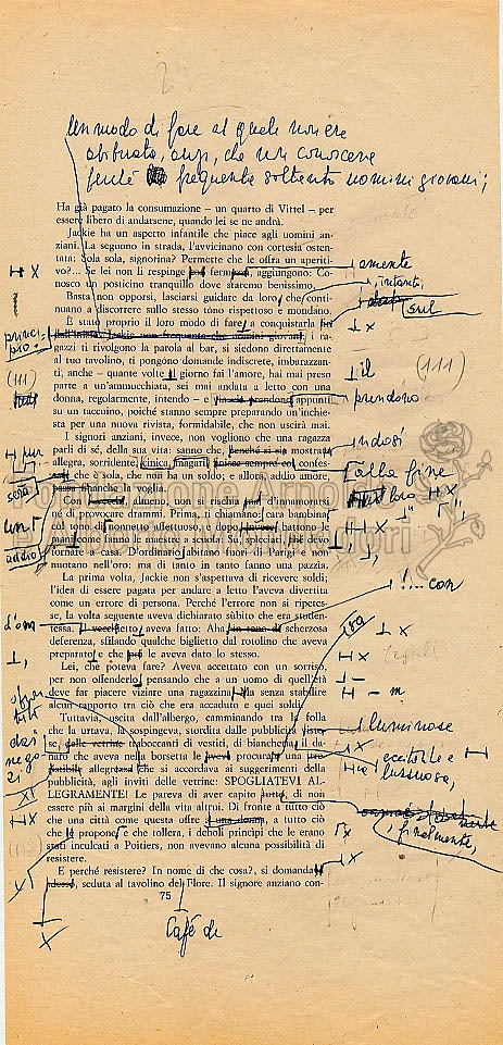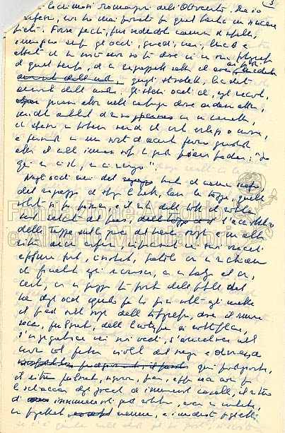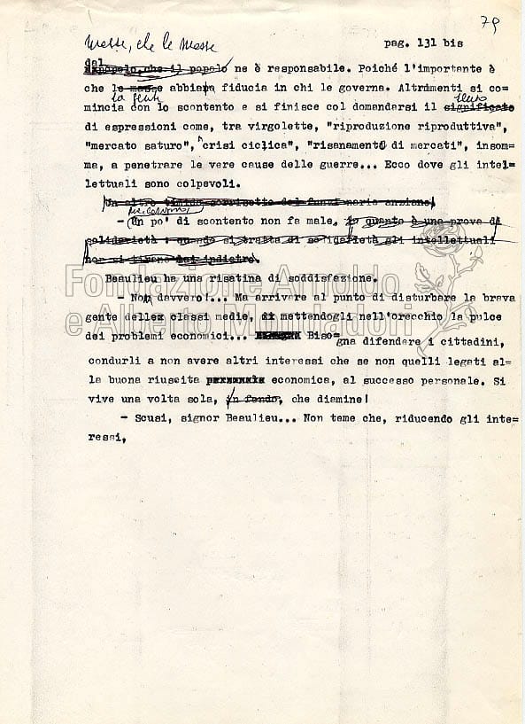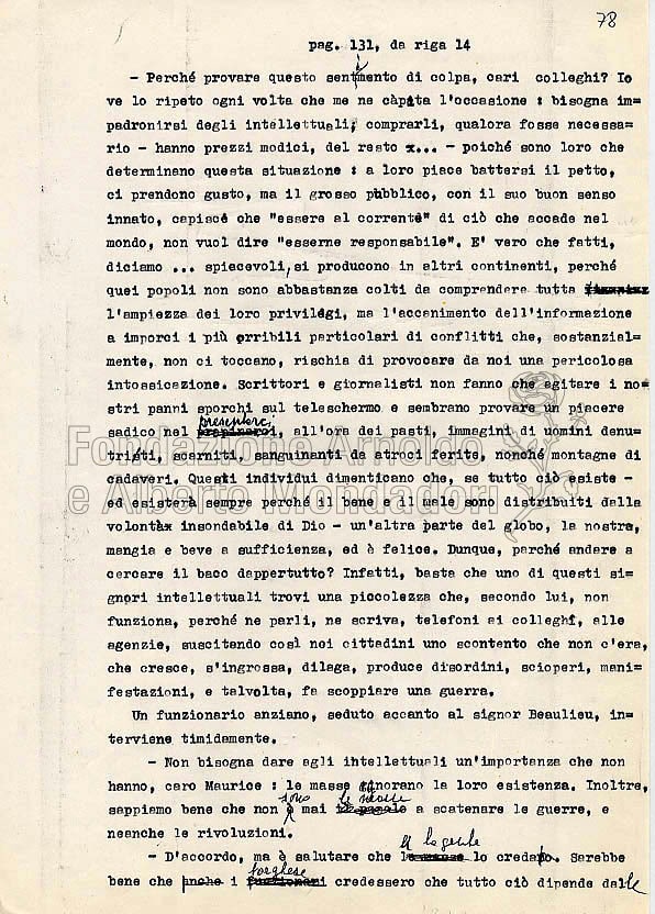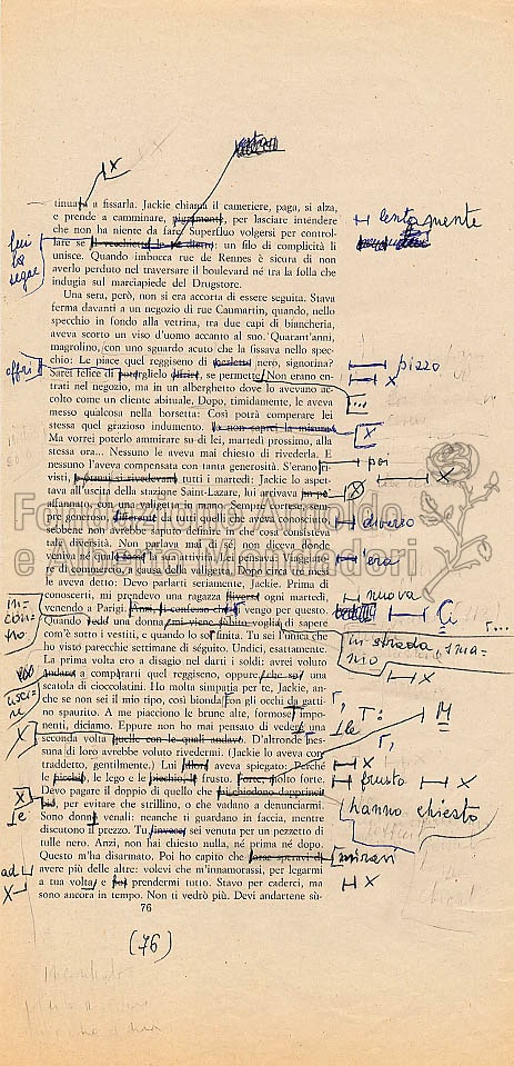 Quando gli interventi sulle bozze si facevano tanto fitti da renderne impossibile la lettura, era necessaria una nuova stesura delle pagine. La de Céspedes aveva l’abitudine di riscrivere a macchina queste parti e di sostituirle alle bozze divenute ormai inservibili. I fogli qui riprodotti appartengono proprio a un gruppo di dattiloscritti “corrispondenti a punti particolarmente corretti delle bozze non mandate in tipografia”, come avverte un’annotazione di archivio sul frontespizio del plico.