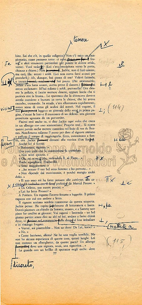Della versione italiana del romanzo Sans autre lieu que la nuit, sono rimaste (nel Fondo Manoscritti – Narrativa italiana) varie fasi di elaborazione editoriale. Qui si riproducono tre pagine consecutive di bozze di stampa con correzioni autografe. Da notare che, nonostante il testo sia già in bozze, gli interventi dell’autrice non si limitano a emendare refusi tipografici, ma riguardano anche varianti lessicali se non la riscrittura di intere porzioni di testo.