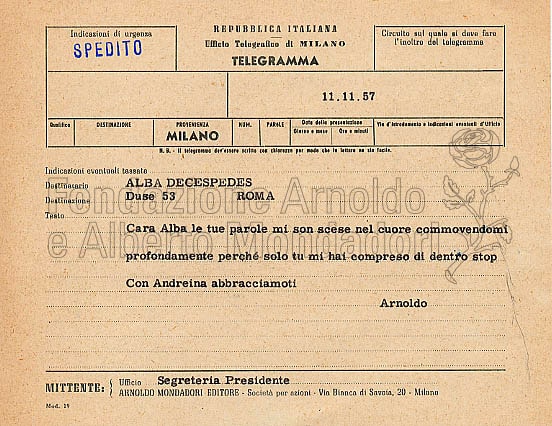 Questo racconto manoscritto è un testo mai raccolto in volume conservato nel Fondo Arnoldo Mondadori, tra le carte editoriali e le lettere intercorse tra la scrittrice e l’editore. Il racconto è dedicato ad Arnoldo Mondadori che rispose all’autrice con il telegramma di ringraziamento qui allegato.