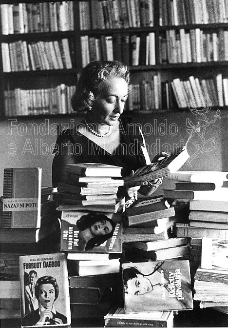 Questa foto ritrae Alba de Céspedes nel suo studio romano, negli anni Cinquanta, circondata dalle traduzioni dei suoi romanzi: ogni libro della de Céspedes può infatti vantare traduzioni in almeno 10 lingue differenti, per 12-15 Editori (il primato spetta a Quaderno proibito, tradotto in 19 Paesi, per ben 27 diverse Case Editrici).