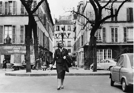 Alba de Céspedes a passeggio per una piazzetta della capitale francese nel maggio 1958, nel corso di uno dei suoi frequenti soggiorni in Francia.