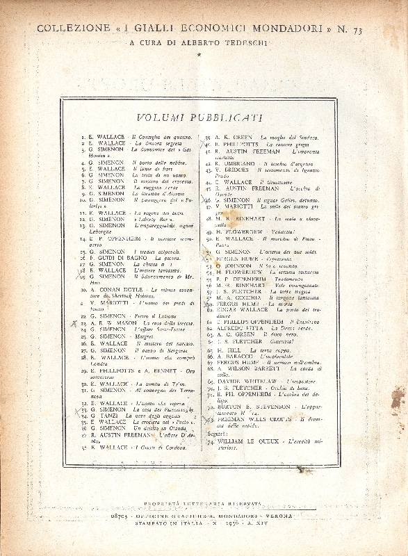 Elenco dei volumi pubblicati nei “Gialli economici” dal 1933 al 1936. Si nota la massiccia presenza di Simenon e Wallace.