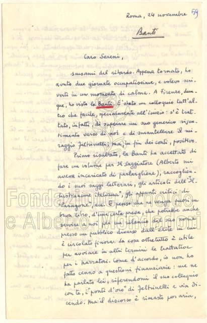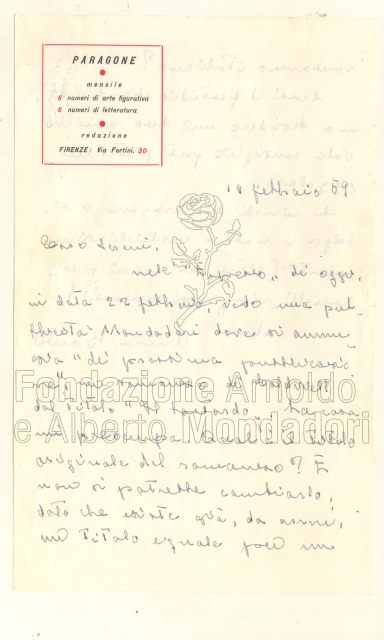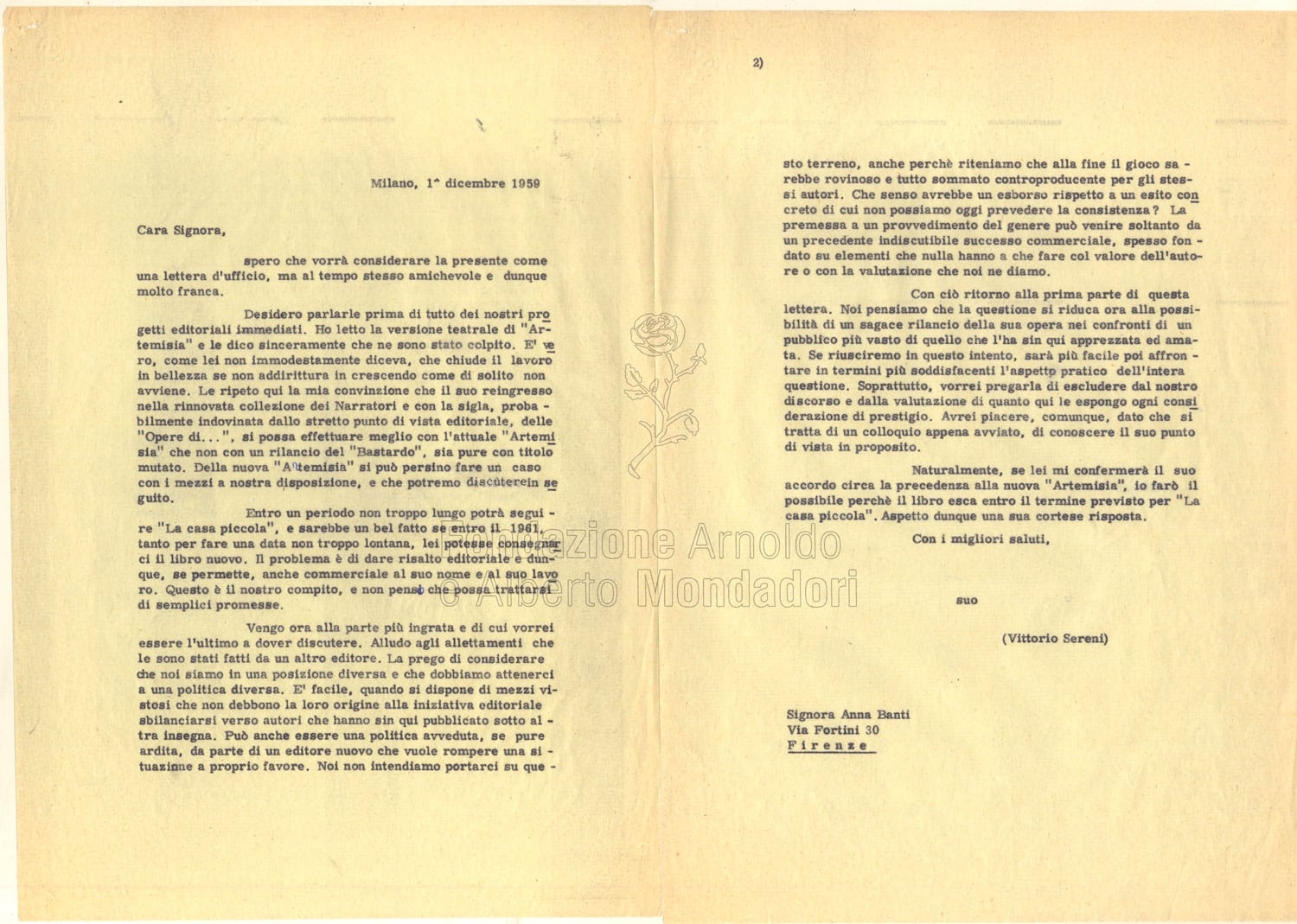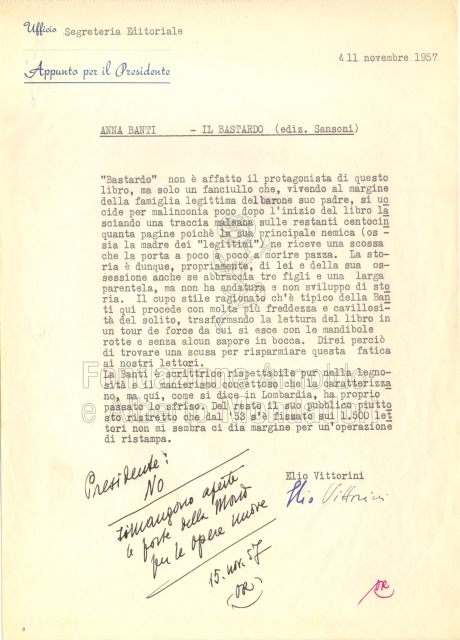 Nel 1959 si pensa all’inserimento della Banti nelle “Opere di…” anche perché, come sottolinea l’allora direttore letterario Vittorio Sereni, «la Banti è una di quelle tre o quattro donne scrittrici che influiscono anche troppo su ambienti con i quali abbiamo quotidianamente a che fare» (12 febbraio 1959, lettera da Sereni al Presidente). Per meglio comprendere questa affermazione dobbiamo ricordare che la scrittrice aveva già fondato in quel periodo la rivista «Paragone» di cui curava la parte letteraria, e dunque già si prospettava come soggetto catalizzatore del panorama letterario italiano con il fine, attraverso la rivista, di inserire «il monologo che ogni vero autore (artista o critico) volge entro di sé fino alle ragioni più integre che lo determinarono» («Paragone», editoriale n. 2, febbraio 1950).