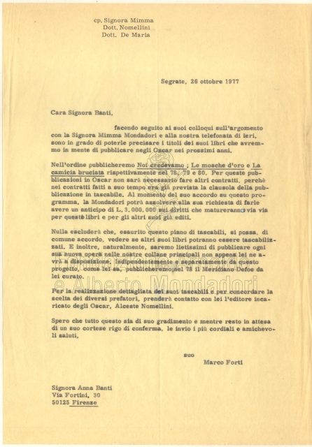 La lettera riferisce il piano delle ristampe nella collana Oscar di alcuni scritti di Anna Banti: Noi credevamo, Le mosche d’oro e La camicia bruciata seguiti dal “Meridiano” Defoe in progetto per il 1978.
