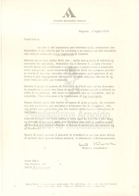 Mimma Mondadori rassicura l’autrice sul contratto per la traduzione di La vagabonde di Colette: nonostante le reticenze di Nomellini, responsabile dei “Tascabili”. La traduzione bantiana avrà un cospicuo anticipo di un milione di lire, cifra che vuole attestare la stima per la scrittrice.