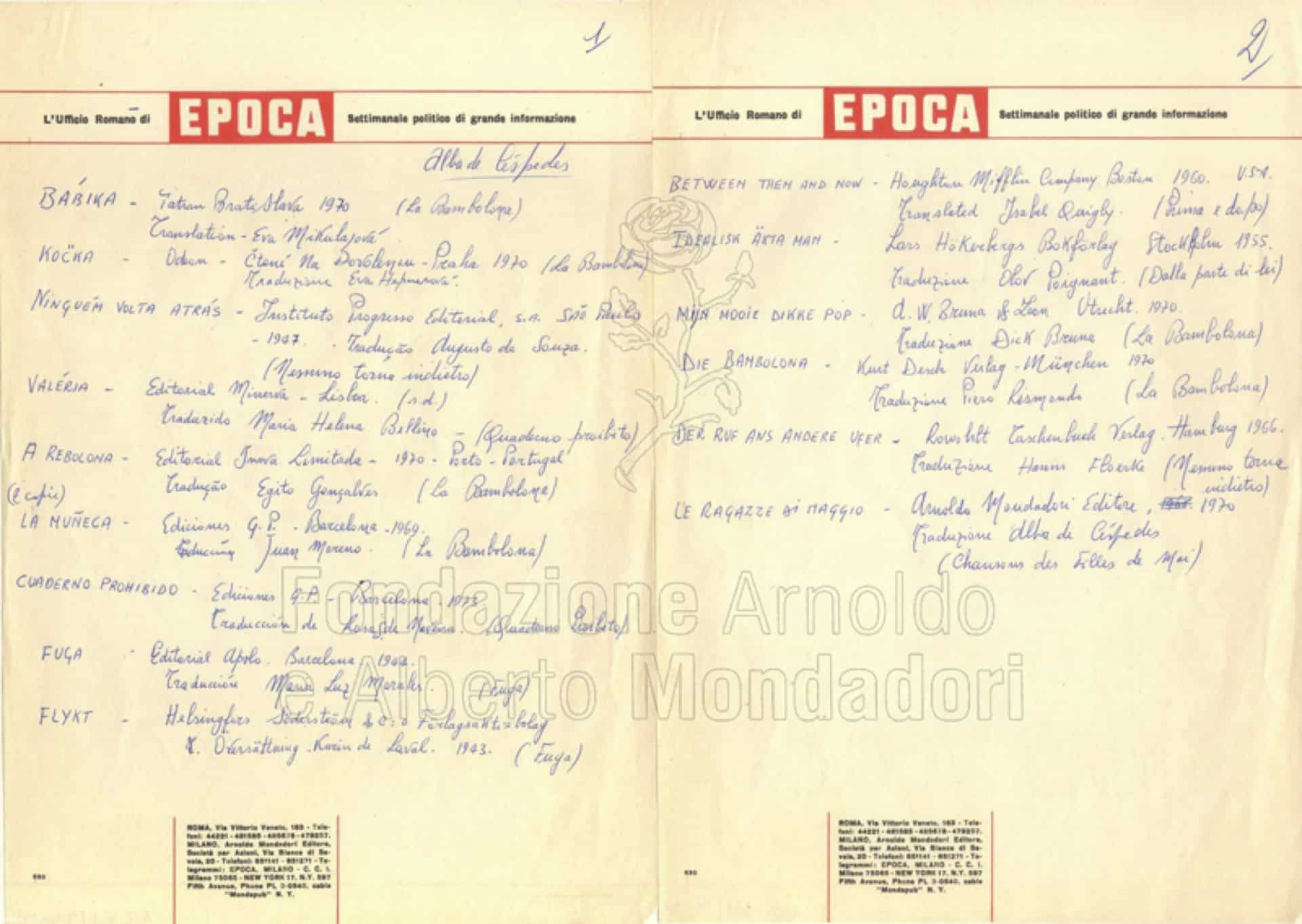 Numerosi gli elenchi, le liste di traduzioni, ordinati per paese, ma anche per opera, che de Céspedes redigeva, ossessionata dal desiderio di avere una mappa della sua presenza all’estero.
