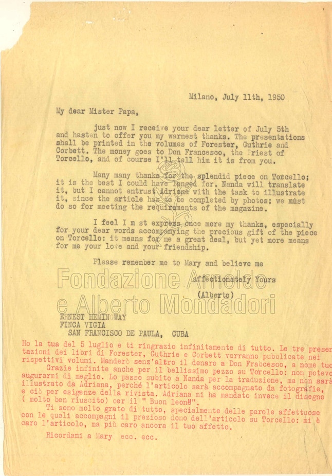 Ogni romanzo della serie Hemingway ha una breve introduzione dell’autore che presenta l’opera. In questa lettera ad Alberto del 5 luglio 1950 troviamo il commento ai primi due volumi inseriti nella “Medusa”, ovvero African Queen di Forester e The Big Sky di Guthrie, più un terzo per The Man eating Leopard che però sarà pubblicato nei “Quaderni della Medusa”. Si nota inoltre la generosità dell’autore che scrive: «You do not have to pay me anything. Because it something of love. But I wish you would send the money to Dom Francesco, the Priest of Torcello and tell him it is from me. He can use it any way he wants».