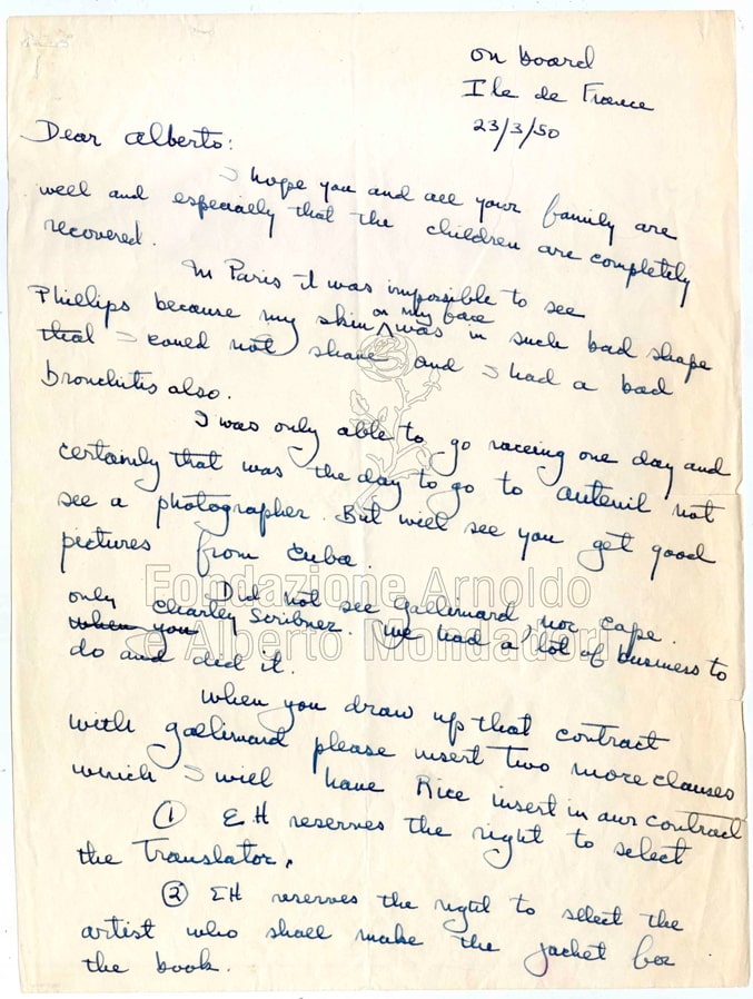 In questa lettera del 23 marzo 1950 scritta da Hemingway a bordo dell’Ile de France, notevole anche per lo slang dell’autore, si trova il disegno del simbolo che verrà utilizzato sulle copertine della “Medusa” a indicare i titoli scelti da Hemingway. Rimarca poi il suo diritto di scegliere autonomamente l’autore dei disegni di copertina e il traduttore per le proprie opere, lamentandosi dell’edizione francese: «The Marcel Duhamel translations I read in Paris and did not like».