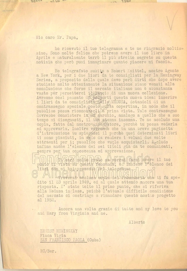 La lettera di Alberto del 10 ottobre 1949 spiega i motivi della rinuncia alla «Hemingway Series» a favore di un inserimento nella “Medusa” dei titoli selezionati e presentati dallo scrittore americano.