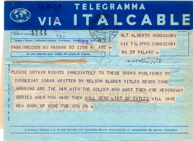 In questo telegramma del 4 ottobre 1949, Hemingway scrive per segnalare due titoli di Nelson Algren per la collezione a lui dedicata.