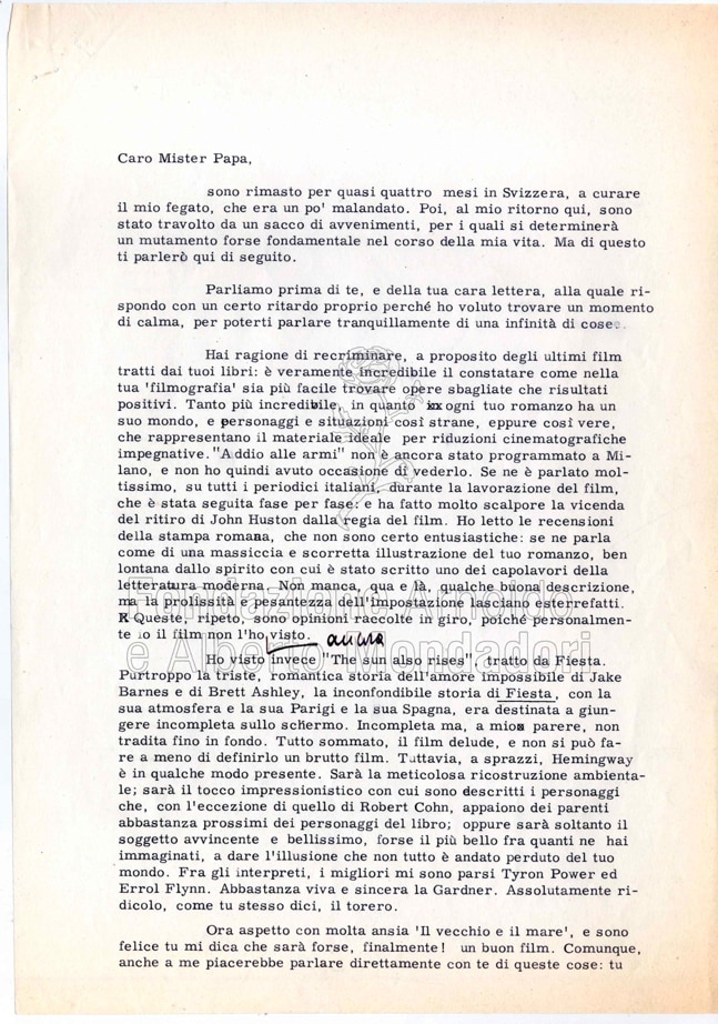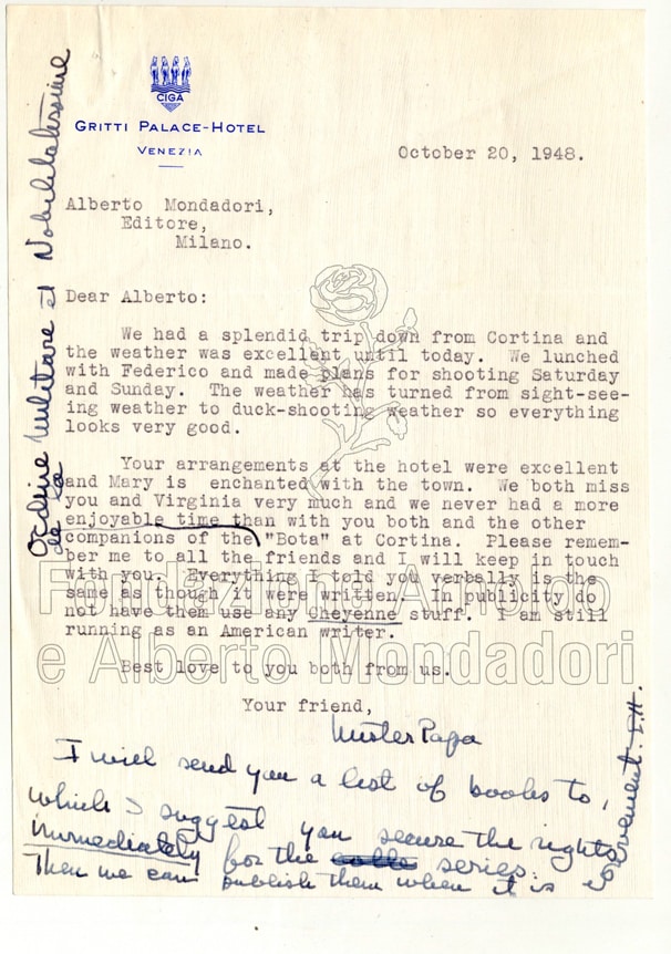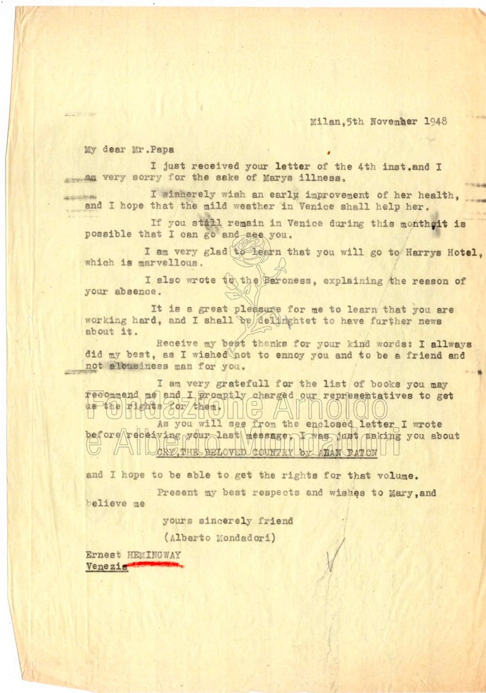 In questa lettera di Alberto a Hemingway del novembre 1948 si intravede il progetto avviato dal loro primo incontro a Cortina, la serie Hemingway, ma soprattutto si legge la volontà dell’editore di stringere una sincera amicizia: «I wished not to ennoy you and to be a friend and not alone business man for you».