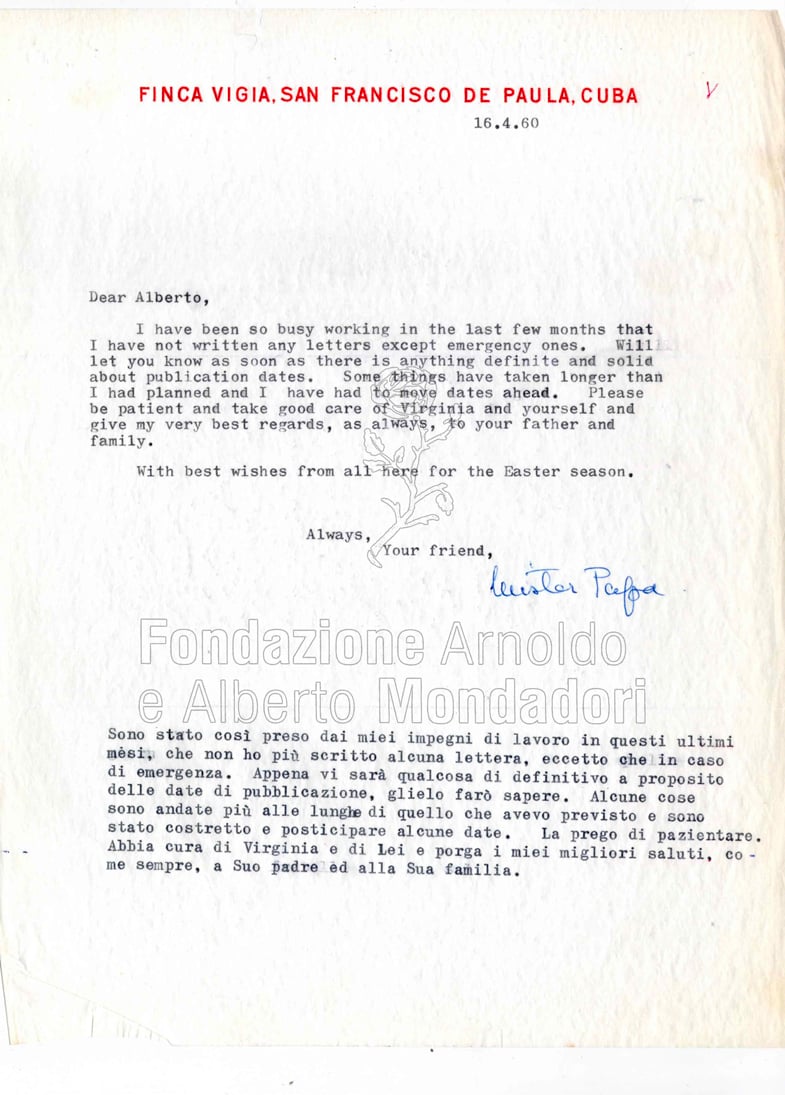 Questa è l’ultima lettera del fascicolo Hemingway inviata ad Alberto. È il 16 aprile 1960, poco più di un anno separa lo scrittore americano dal gesto estremo che gli costerà la vita. Il testo è breve, Hemingway si giustifica per non aver fatto avere più sue notizie perché lavora e non ha quasi scritto lettere ad altri se non per le emergenze. Tra le righe però si legge di un uomo stanco, preoccupato degli affetti più che della scrittura. Con toni quasi di congedo rassicura l’amico e lo invita a prendersi cura della moglie e della sua famiglia: «take good care of Virginia and yourself and give my very best regards, as always, to your father and family». E lo saluta così: «Always, Your friend, Mister Papa».