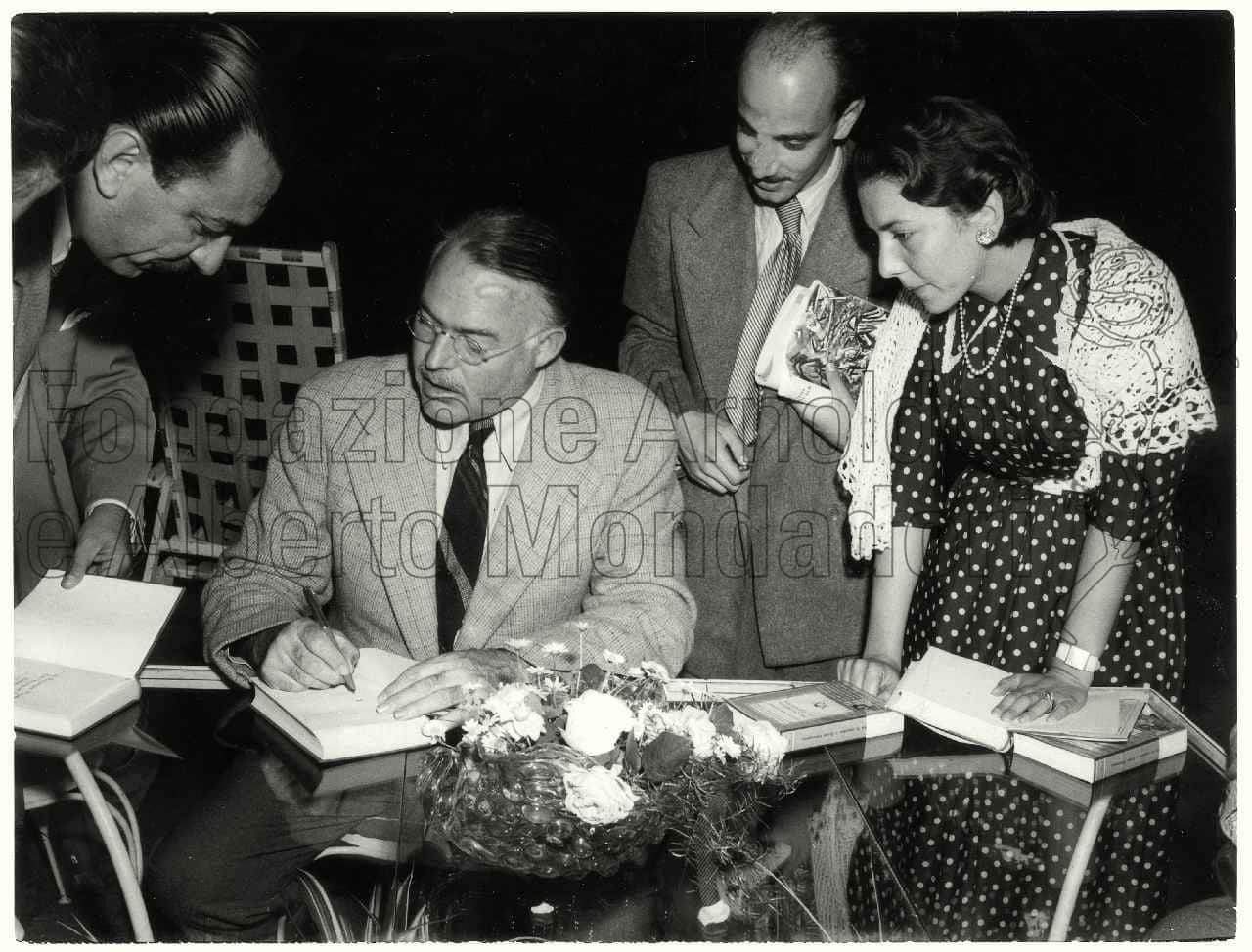 Alberto Mondadori con Ernest Hemingway mentre firma alcune copie dei suoi romanzi nella “Medusa”; accanto a lui Guido Lopez e Mimma Mondadori.