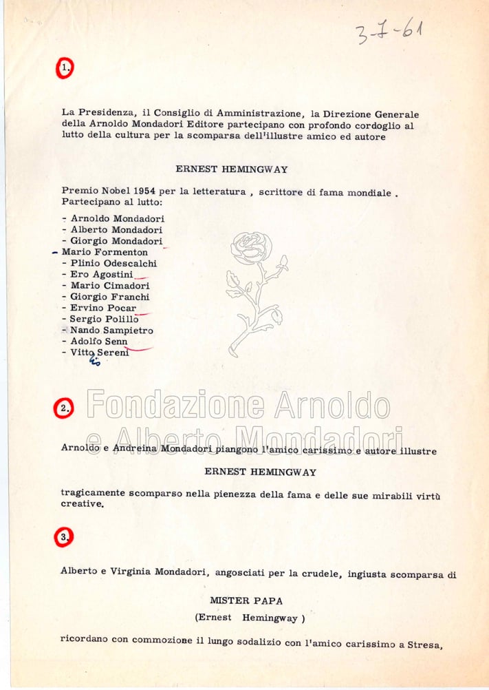 Hemingway si uccide il 2 luglio 1961. Il giorno dopo la Mondadori invia il necrologio a nome di consiglieri e dirigenti della casa editrice, ricordando brevemente il suo valore di autore di fama mondiale, unitamente al comunicato del Saggiatore che invece sottolinea soprattutto l’impegno antifascista di Hemingway. Al di là della cortina ufficiale, è comunque tangibile il dolore personale di Arnoldo e di Alberto per aver perso così tragicamente un grande autore l’uno, un grande amico e modello l’altro.