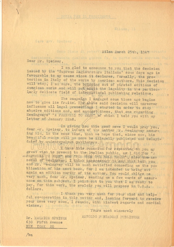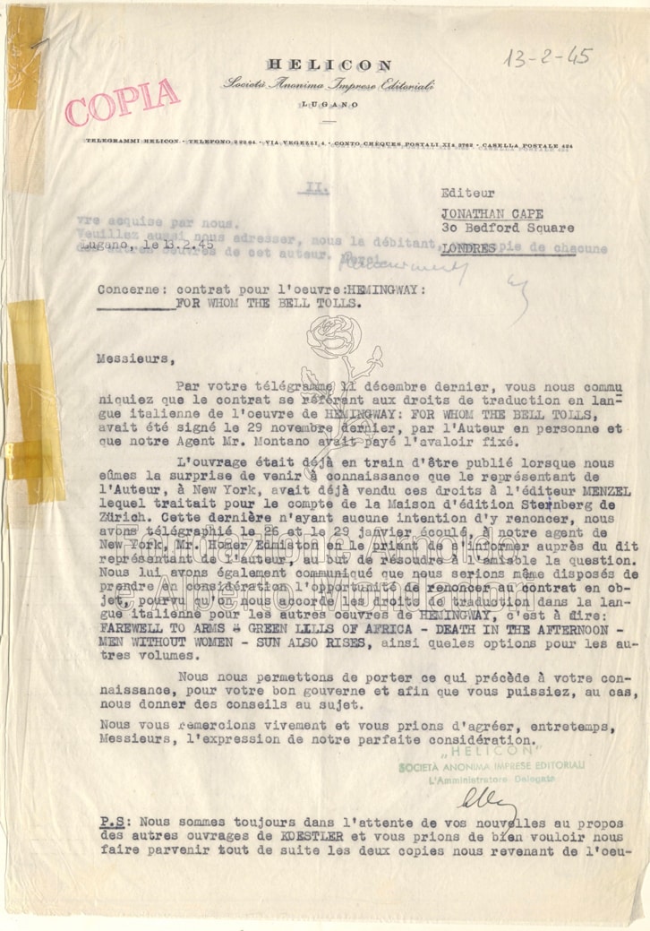 Il 13 febbraio 1945 la Mondadori, su carta intestata Helicon, scrive a Jonathan Cape, editore londinese di Hemingway, riassumendo la situazione contrattuale dell’autore e sottolineando la propria sorpresa nello scoprire che esiste già un altro contratto per i diritti italiani di Per chi suona la campana, con la Steinberg di Zurigo.