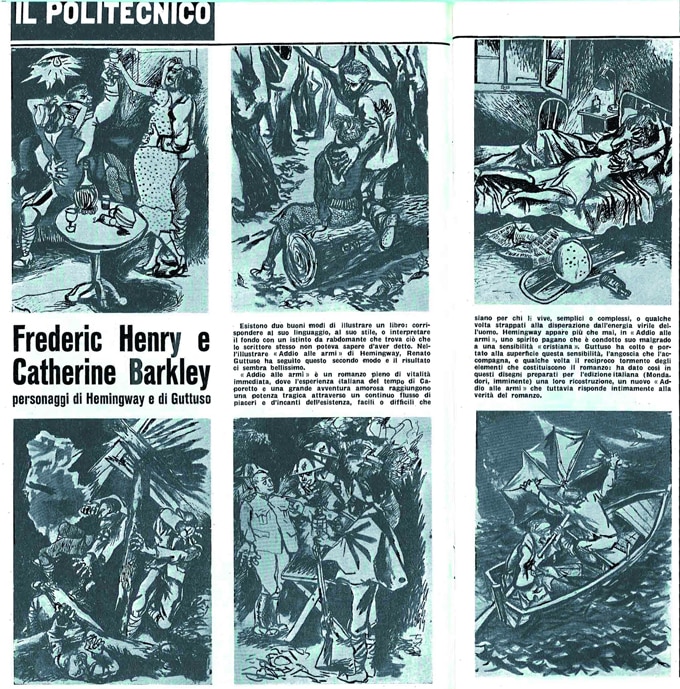 “Il Politecnico” di Vittorini, sul primo numero mensile (1° maggio 1946) pubblicizza l’imminente uscita di Addio alle armi e dedica un articolo alle illustrazioni di Renato Guttuso: «esistono due buoni modi di illustrare un libro: corrispondere al suo linguaggio, al suo stile, o interpretare il fondo con un istinto da rabdomante che trova ciò che lo scrittore stesso non poteva sapere di aver detto. […] Renato Guttuso ha seguito questo secondo modo e il risultato ci sembra bellissimo. […] Hemingway appare più che mai in Addio alle armi uno spirito pagano che è condotto suo malgrado a una sensibilità «cristiana». Guttuso ha colto e portato alla superficie questa sensibilità, l’angoscia che l’accompagna, e qualche volta il reciproco tormento degli elementi che costituiscono il romanzo: ha dato cosi in questi disegni preparati per l’edizione italiana (Mondadori, imminente) una loro ricostruzione, un nuovo Addio alle armi che tuttavia risponde intimamente alla verità del romanzo».