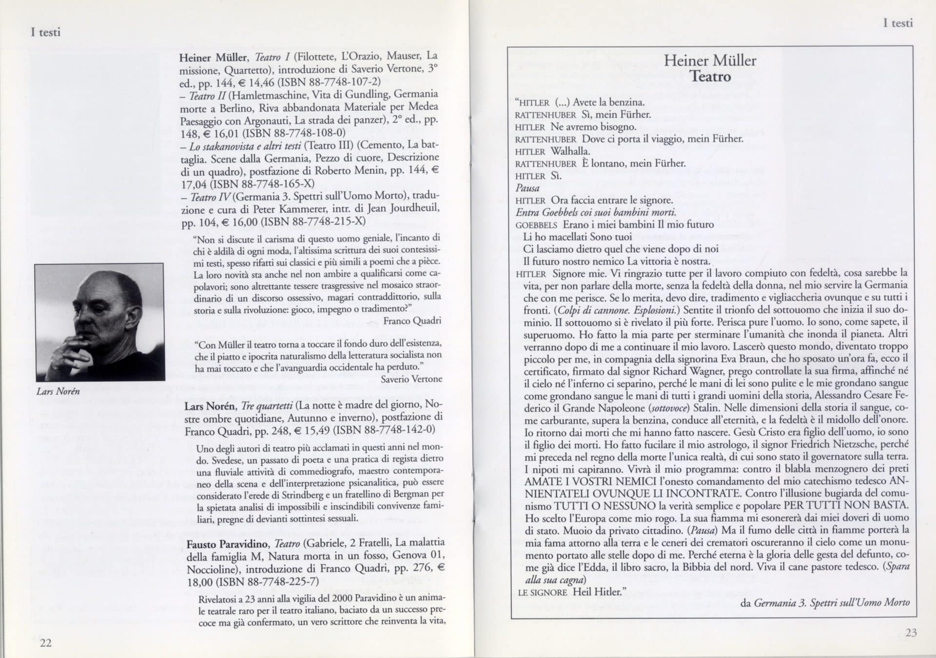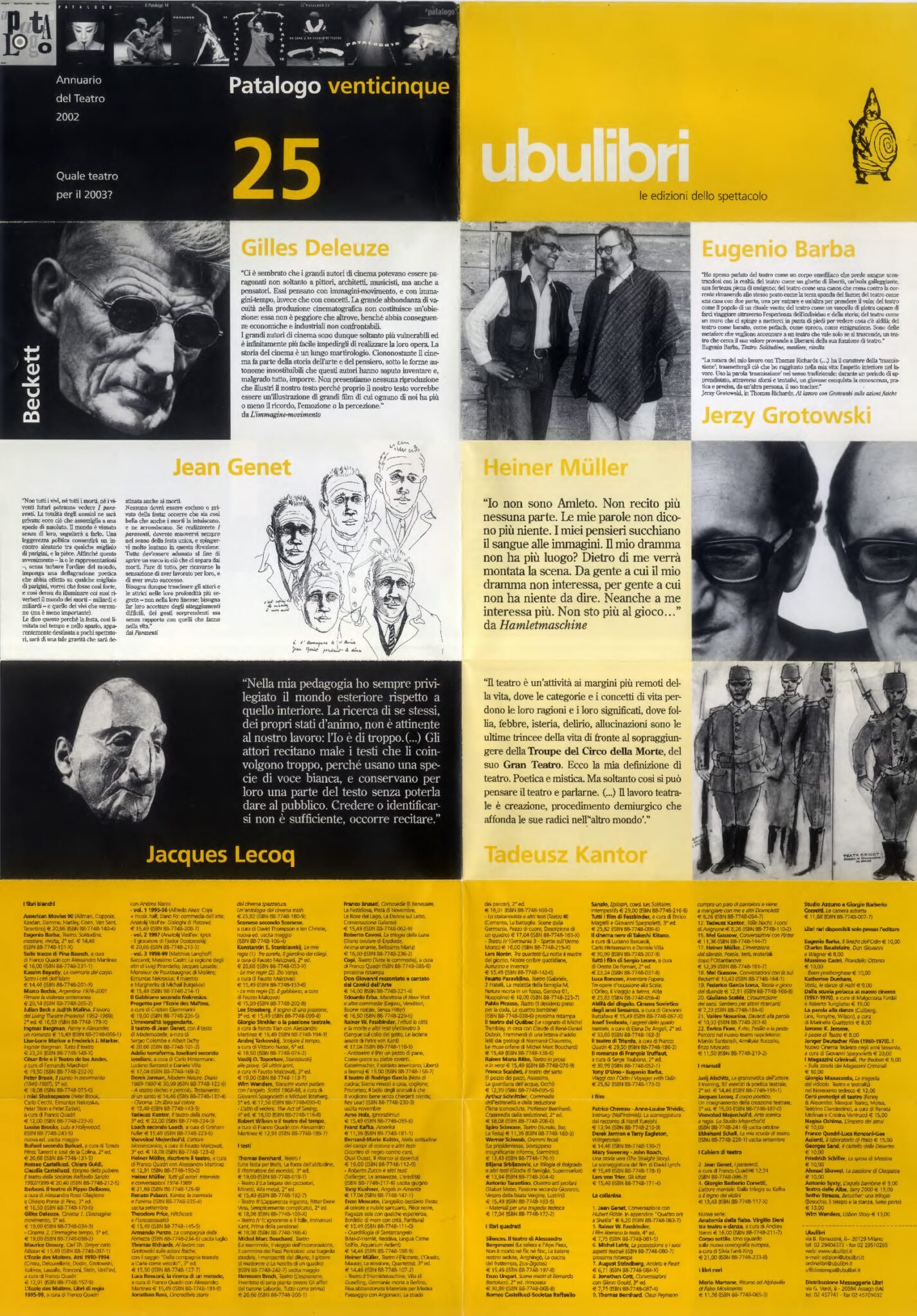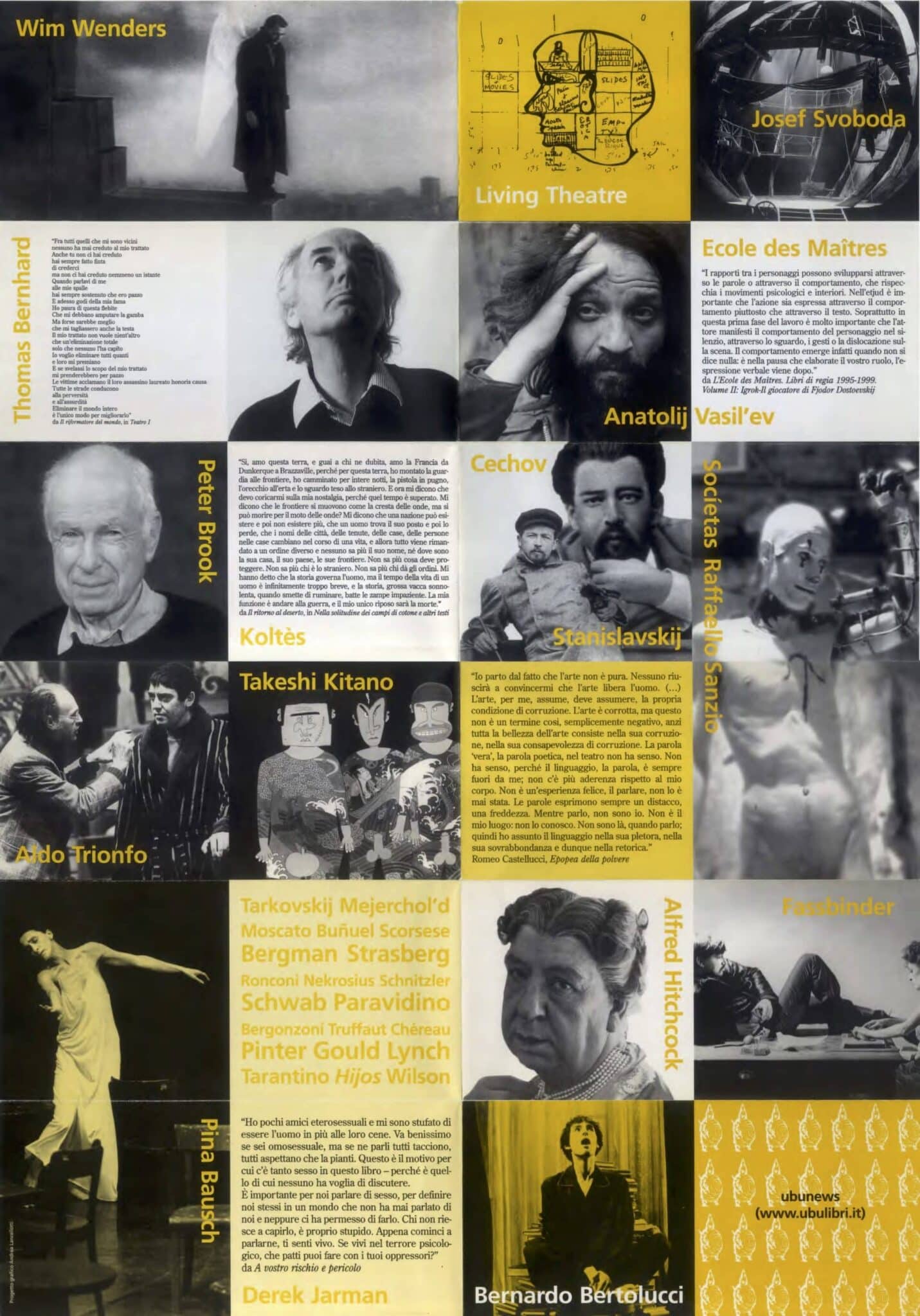 I diari di Franco Quadri e della sua compagnia Ubu sono i fascicoli dei cataloghi Ubulibri. Libretti che registrano, anno per anno, le nuove pubblicazioni e fanno il punto sui volumi già editi. Ma non solo. Ogni anno diversi nella veste editoriale, rigorosa, elegante, o bizzarra, fantasiosa o stravagante, nascono in un formato molto allungato verticalmente (catalogo 1984, ad esempio), tipicamente Ubu; da sfogliare regolarmente, come un libro, tenendo verticale il dorso graffettato, o da ruotare, le pagine da voltare dal basso all’alto lungo il dorso coricato orizzontalmente (catalogo 1999). Oppure, possono essere la piegatura di un foglio unico in origami, che sventagli la proposta delle nuove pubblicazioni sulle due facce del largo foglio secondo il dispiegamento delle piegature (catalogo 2002), illustratissime. La ricchezza di immagini, fotografie e giochi per l’occhio, impreziosisce queste pagine e questi fogli – si osservi il bianco e nero in doppia pagina di Carmelo Bene e Roberto Benigni nel catalogo 1984: compresenti i due sul palco della seconda edizione dei Premi Ubu, e divisi dall’espressione del viso, dalla pungenza dello sguardo, dal carico di coppe, e dalla piega di costa. Possono offrire descrizioni “da quarta” delle nuove pubblicazioni (si leggano le presentazioni a tutta pagina dei “Film ubulibri” dedicati alle sceneggiature di Wenders nel catalogo 1984), o pubblicare in gran riquadro estratti dei nuovi testi editi (come nel catalogo 2005 gli assaggi da Teatro IV, Il presidente, di Thomas Bernhard, o da Germania 3. Spettri sull’uomo morto di Heiner Müller). Possono poi nascondere la propria datazione: non riportare l’anno di riferimento, ma suggerire il termine post quem dell’ultimo annuario pubblicato. Sono guide: ma talvolta per enigma, ubuescamente. Chiusi e voltati, i cataloghetti offrono infine il suggerimento di «una raccolta di informazioni come sogno di una “rivista” on-line»: virtuale avvio ad una navigazione nel sito ubulibri.it, da solcare su acque telematiche cui approdare a porti e scali secondo le coordinate della carta Ubulibri.