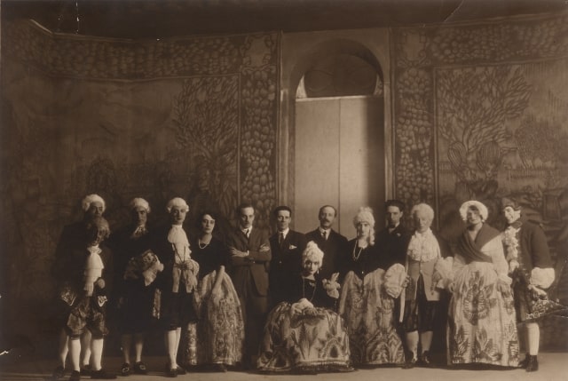 Manuel Fontanals, Enzo Ferrieri ed Eugenio Levi con la compagnia del Teatro d’Arte del Convegno, sulla scena de Gli innamorati di Carlo Goldoni, Palazzo Litta, 1924